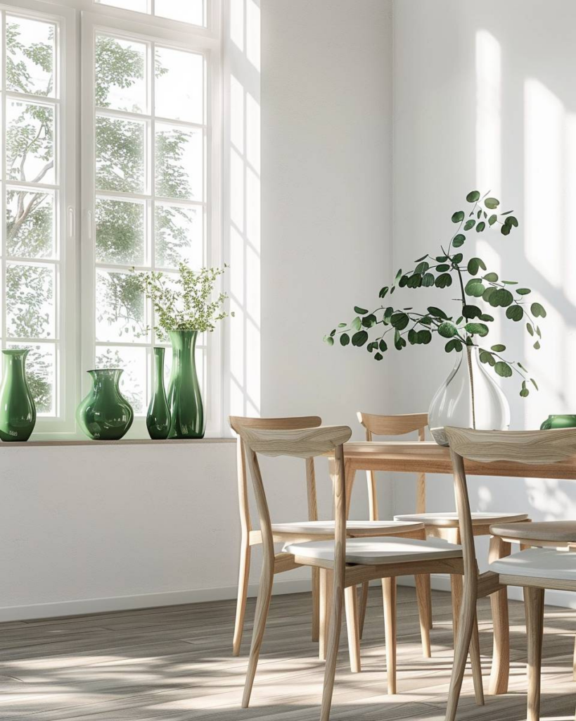 Setze die Fensterbank in Szene, indem du grüne Vasen in verschiedenen Formen und Höhen nutzt. Glas und Keramik passen immer. Wähle frische Pflanzen oder schlichte Zweige als Füllung. So wirkt dein Esszimmer lebendig und einladend.