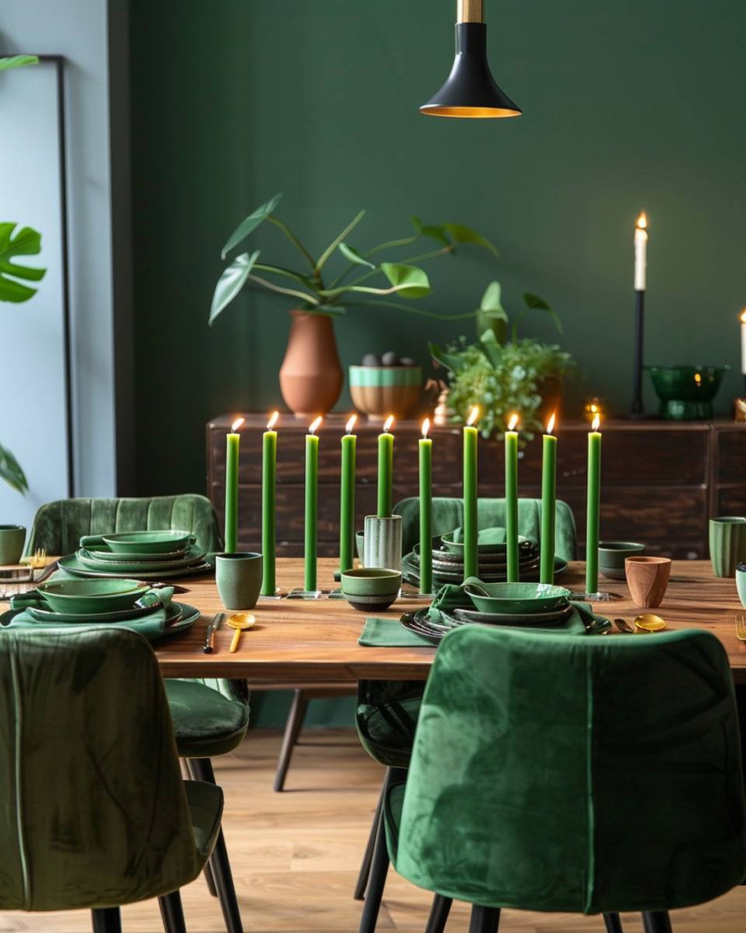 Stelle grüne Kerzen mittig auf den Tisch. Runde Formen harmonieren gut mit langen, schmalen Kerzenhaltern. Wir wählen matte oder leicht glänzende Oberflächen. Kerzen in verschiedenen Höhen bringen Lebendigkeit. Tischläufer in Grün oder Weiß passt bei einem grünen Esszimmer.