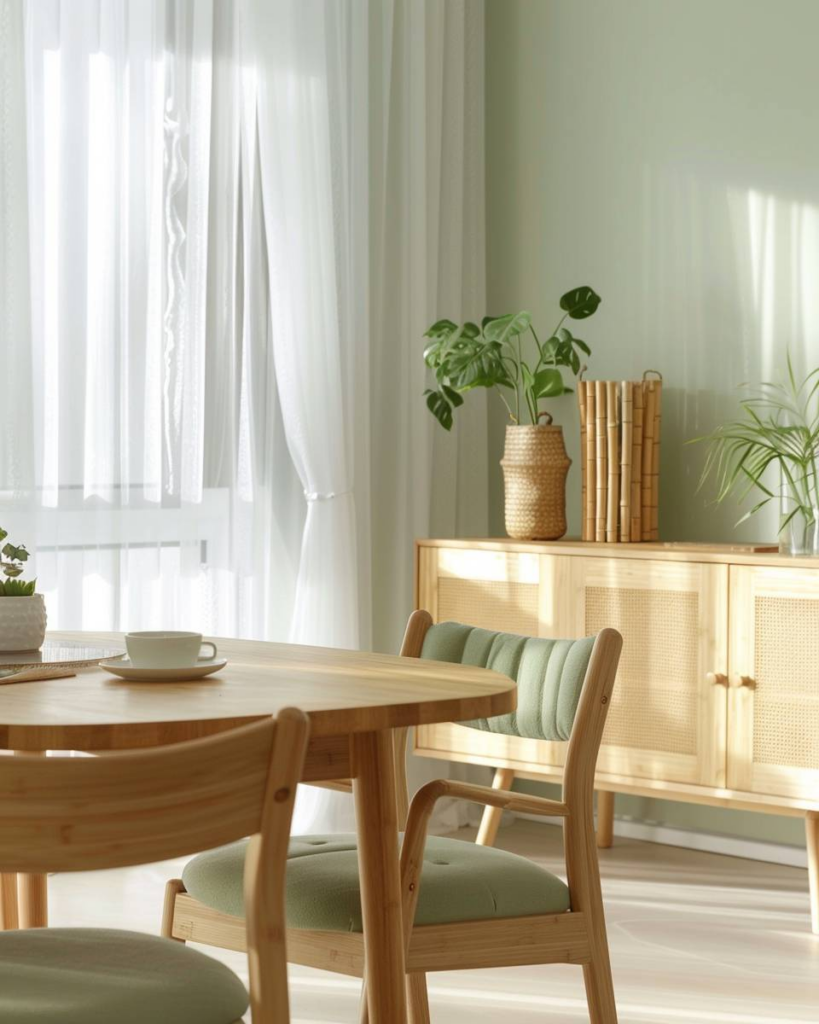 Wähle sanftes Salbeigrün für die Decke. Diese Farbe wirkt frisch und bringt Ruhe. Die Kombination mit Holz und hellen Möbeln gibt dem Esszimmer ein freundliches Gefühl. Wir schaffen mit Salbeigrün eine helle, entspannte Atmosphäre. Deine Gäste fühlen sich wohl.