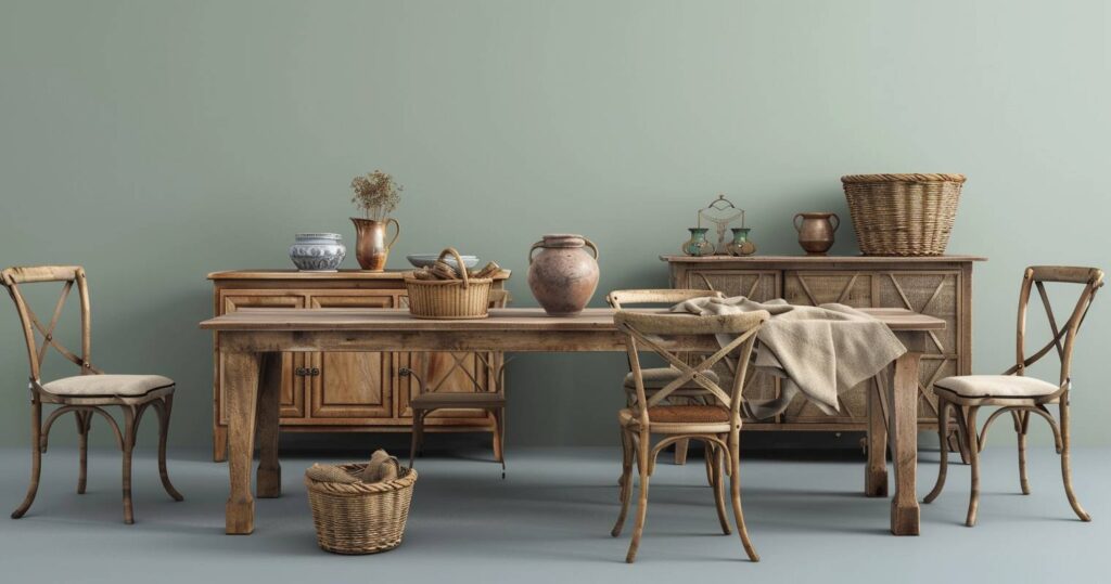 Setze auf Holz, Leinen und Keramik, um das Esszimmer authentisch und wohnlich zu gestalten. Ein massiver Esstisch aus Holz strahlt Wärme aus. Leinenservietten und Keramikteller schaffen Ruhe und Struktur. Pflanzen verstärken das natürliche Gefühl und lockern den Raum auf.