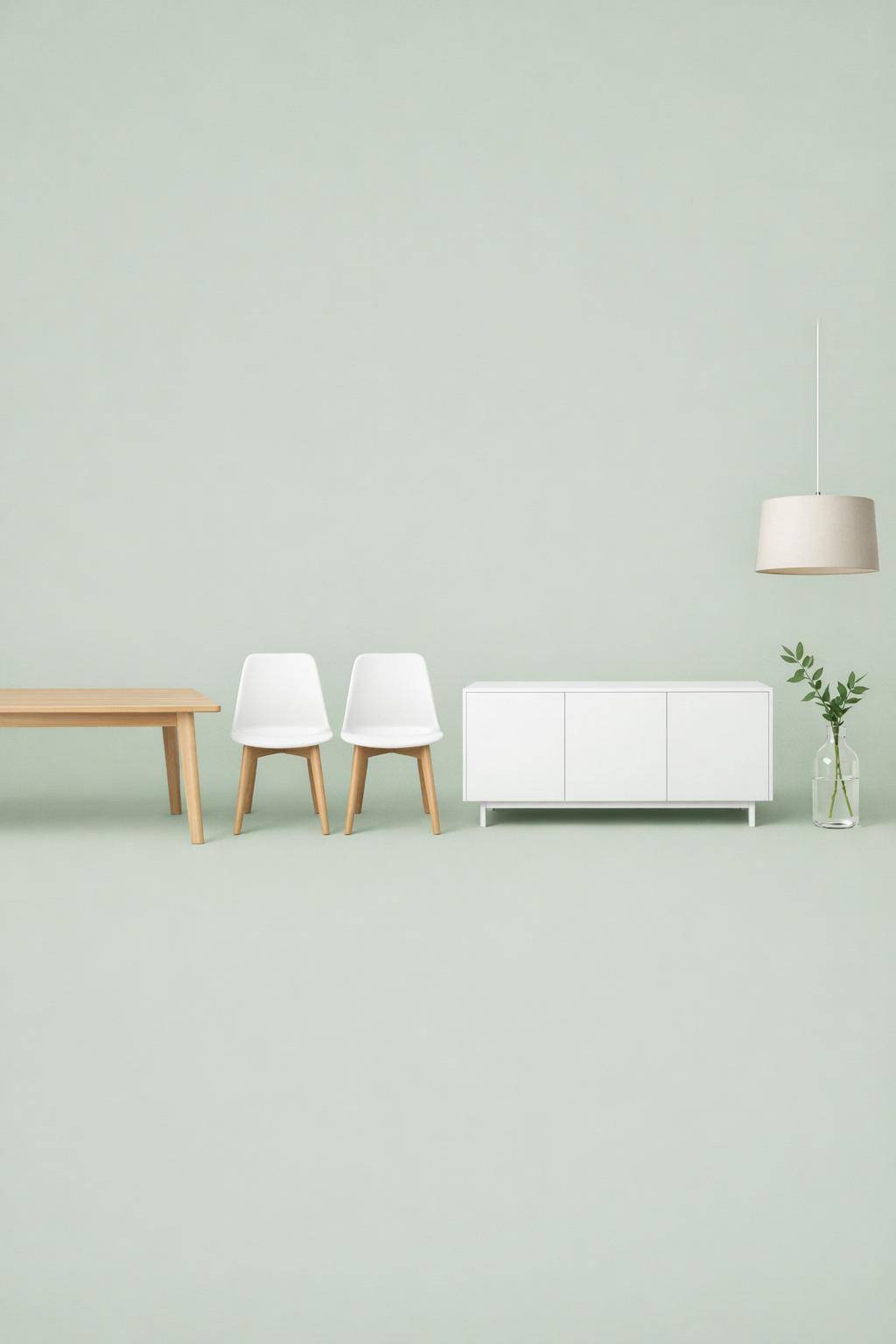 Wähle klare Möbel in zurückhaltenden Farben. Ein rechteckiger Holztisch mit glatten Kanten bringt Ruhe. Setze auf Stühle ohne Schnörkel und mit schlichten Beinen. Verzichte auf Verzierungen und Muster. So bleibt dein Esszimmer aufgeräumt und offen.