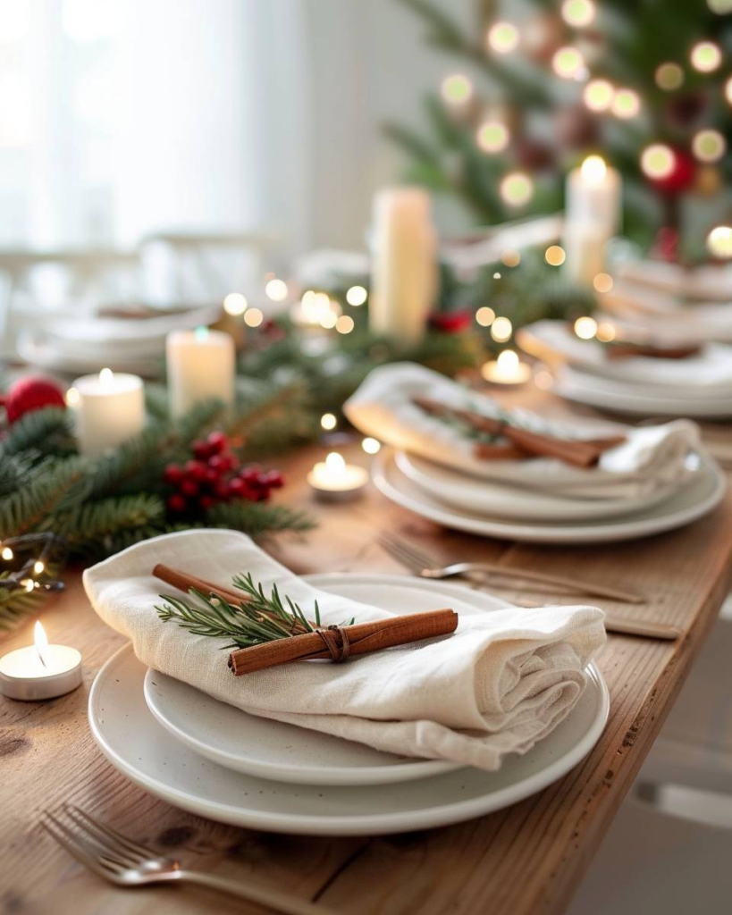 Platziere duftende Zimtstangen direkt auf den Servietten. Zimtstangen verbreiten einen angenehmen Duft und passen optisch zu jedem Weihnachtstisch. Wir binden die Zimtstangen mit einem Band fest und ergänzen sie mit einem kleinen Tannenzweig für mehr Natürlichkeit. Servietten, Geschirr und Zimt harmonieren zusammen und lassen dein Esszimmer festlich wirken.