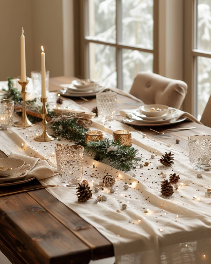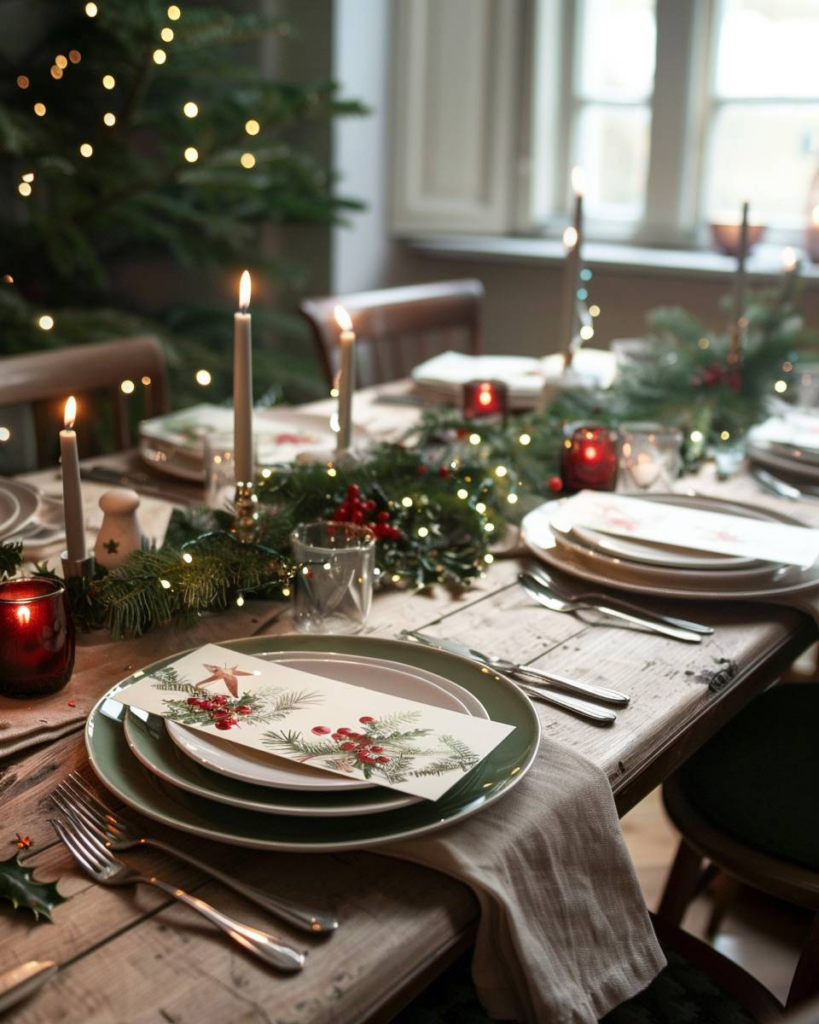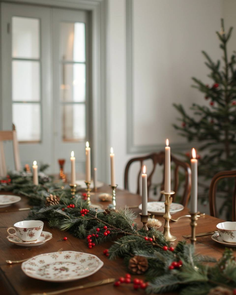 Lege Tannenzweige locker auf den Tisch. Frische Zweige duften angenehm und bleiben lange grün. Wir verteilen kleine Akzente aus Zapfen oder roten Beeren dazwischen. So wirkt dein Tisch festlich und natürlich.