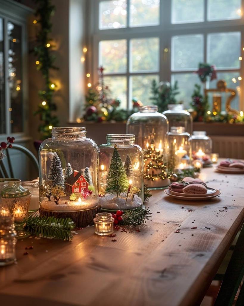 Platziere Mini-Winterlandschaften im Glas auf dem Tisch