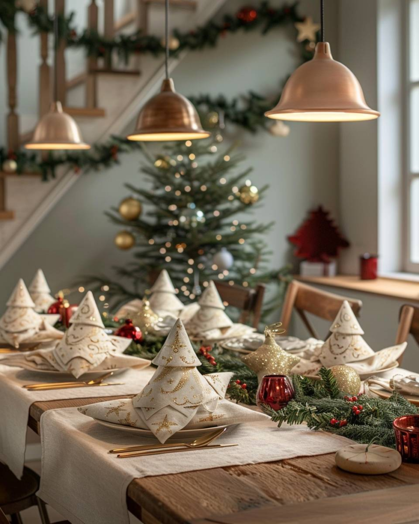 Lege Stoffservietten zu Tannenbäumen, Sternen oder Weihnachtsmützen und schaffe festliche Hingucker. Wir nehmen am besten feste, gebügelte Stoffservietten und wählen Farben wie Rot, Grün oder Weiß. Falten wir nach einfachen Anleitungen, wirken unsere Servietten ordentlich und einladend auf dem Teller. Ein kleiner Zweig oder eine Schleife gibt deinem Tisch das gewisse Extra.