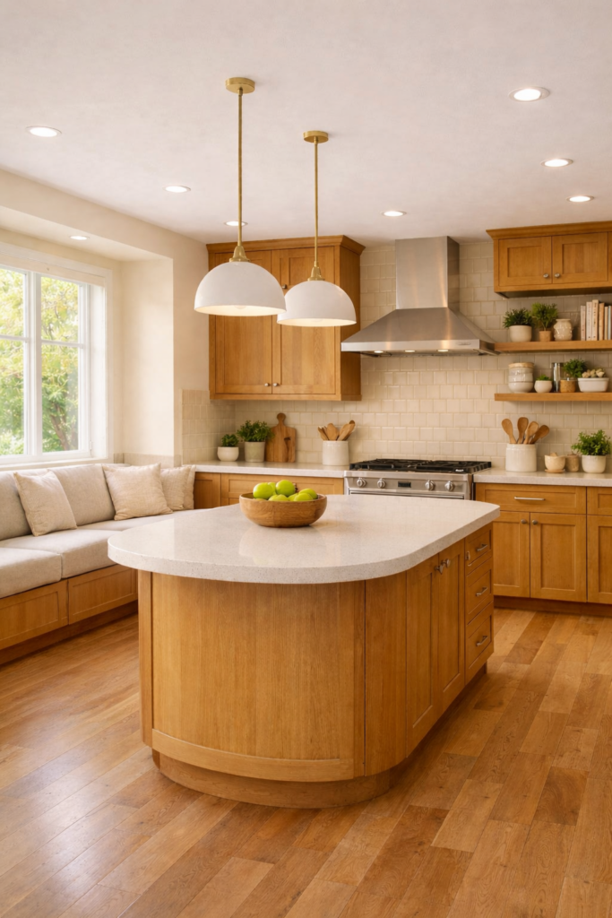 Stelle eine große Essinsel in die Mitte der Küche. So schaffen wir Platz für gemeinsames Kochen, Essen und Hausaufgaben. Eine breite Arbeitsfläche ist praktisch für viele Hände. Hohe Sitzplätze bringen Komfort für alle Altersgruppen. Stauraum unter der Insel hält Küchenutensilien griffbereit.