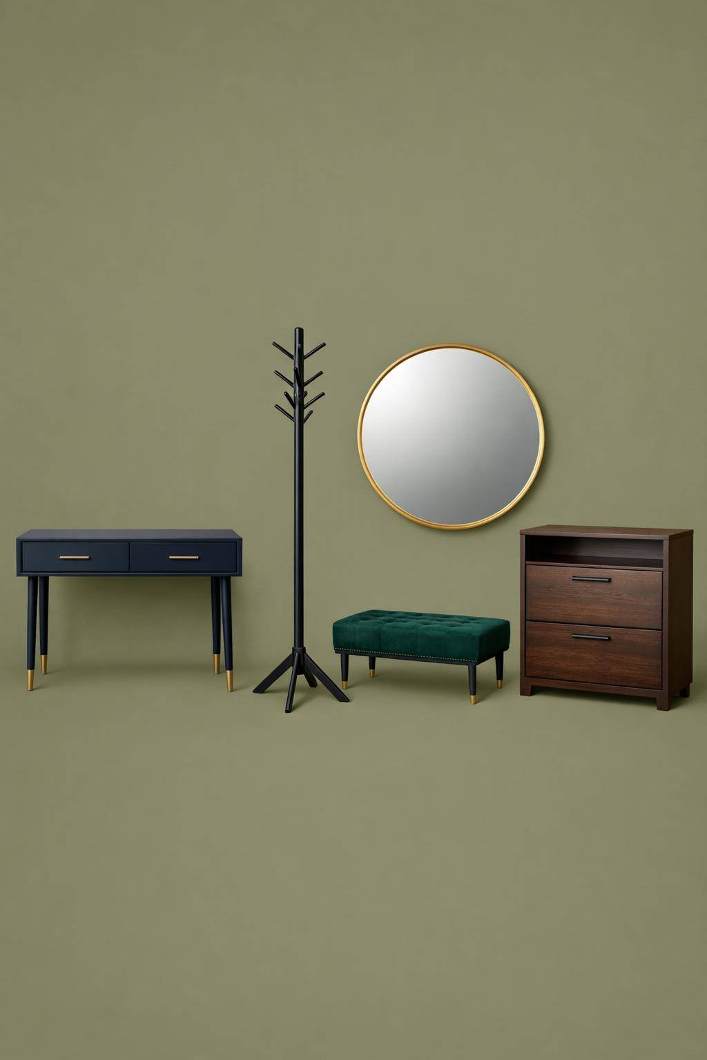 Setze Details aus Messing oder Gold gezielt ein. Ein Spiegelrahmen, Türgriffe oder ein Lampenfuß in diesen Tönen wirkt edel im dunklen Flur. Nutze kleine Schalen oder Vasen mit Goldakzent. Diese Akzente setzen Lichtpunkte und betonen den modernen Look.