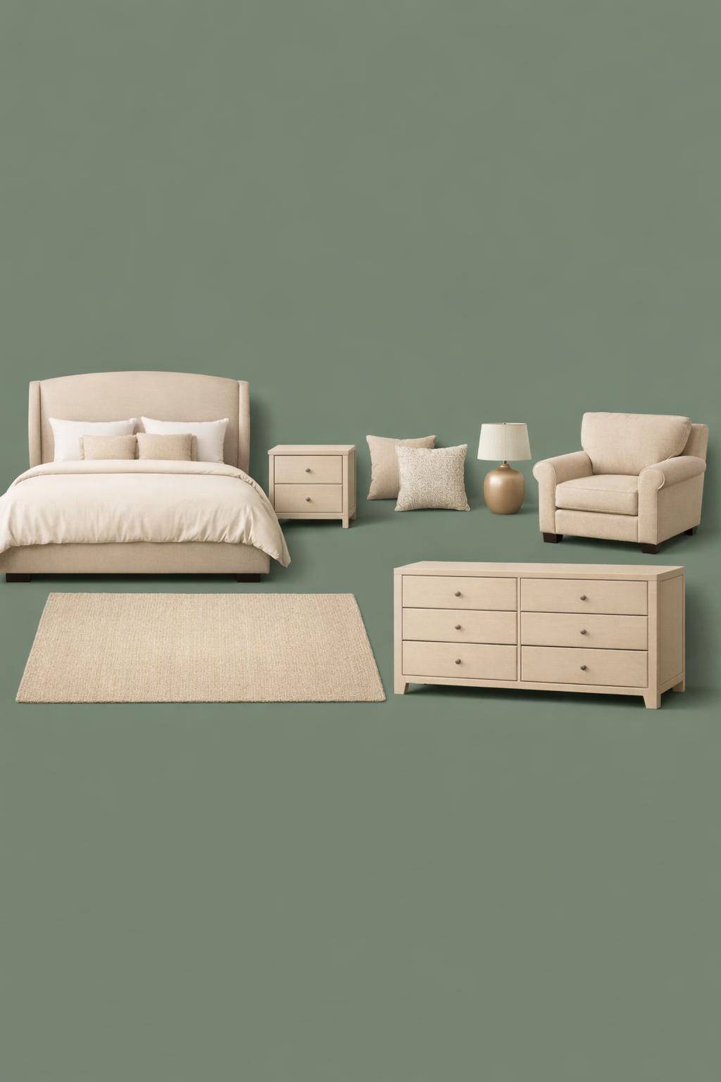 Setze auf wenige Dekorationen für einen minimalistischen Look. Ein einzelnes Bild und eine schlichte Vase auf dem Nachttisch reichen aus. Wähle beige Kissen als Farbakzent. Wir lassen unnötige Accessoires weg und geben dem Raum Ruhe.