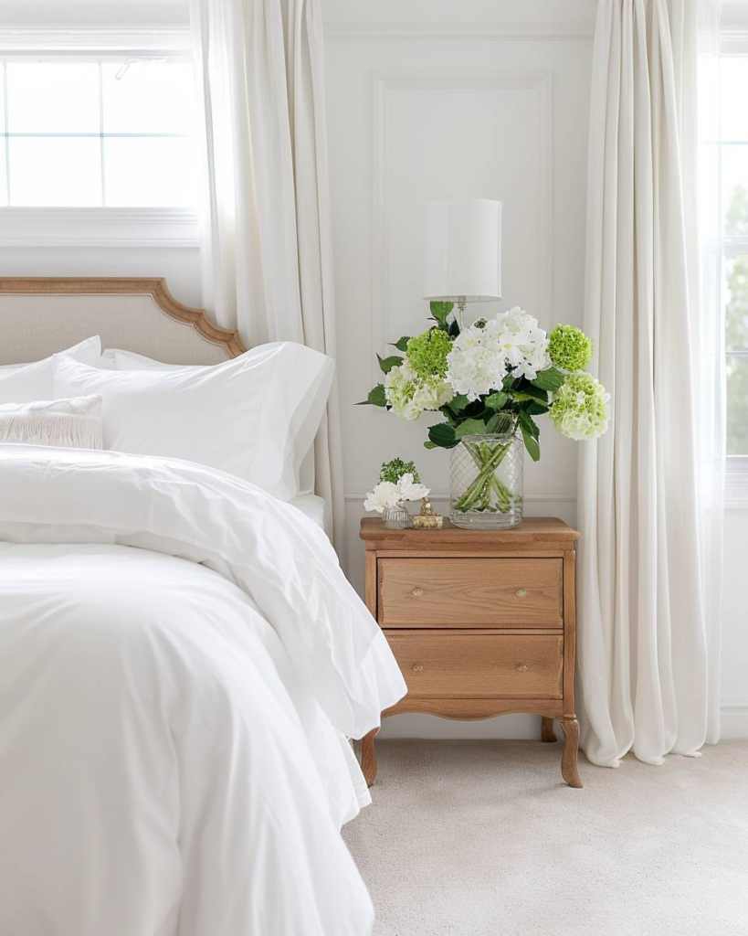 Stelle frische Blumen in einer klaren Glasvase auf den Nachttisch oder das Fensterbrett. Kräftige Farben wie Tulpen, Rosen oder Ranunkeln bringen sofort Leben in den weißen Raum. Wechsle die Sorten regelmäßig, damit das Gästezimmer immer frisch und einladend bleibt.