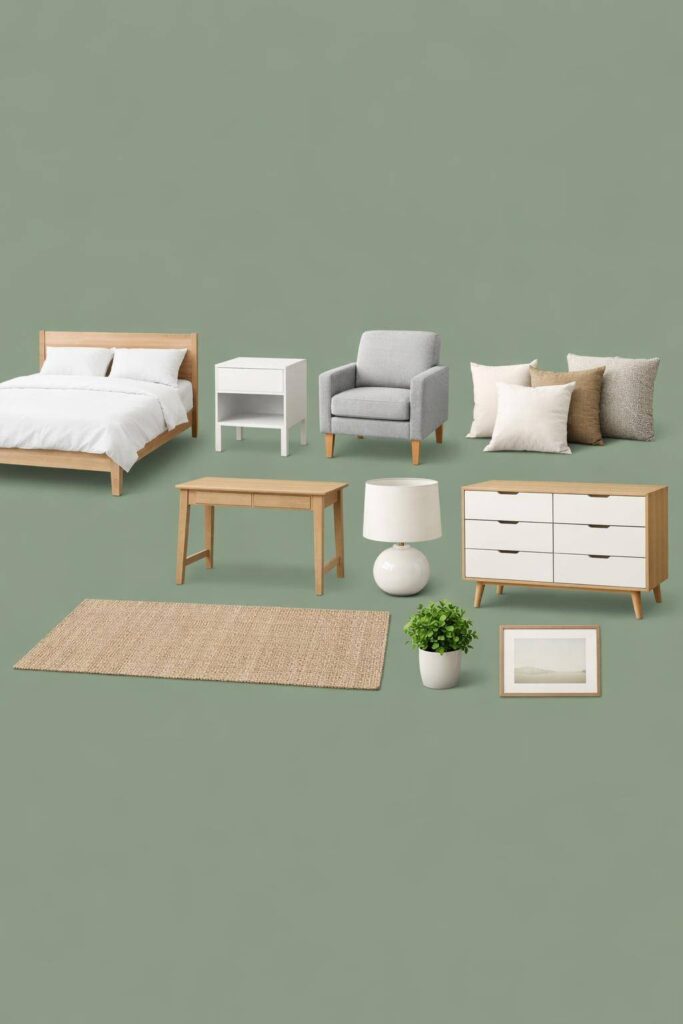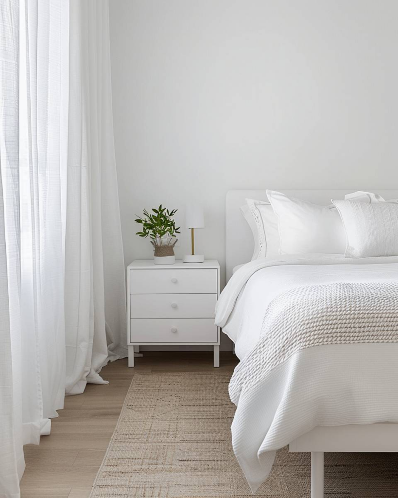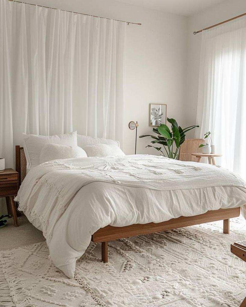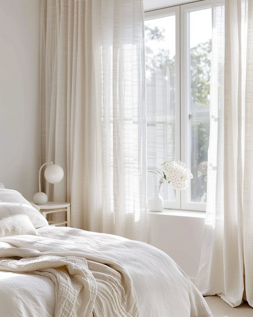 Mit luftigen Leinenvorhängen schaffen wir Leichtigkeit, eine minimalistische Tagesdecke bringt Eleganz, und skandinavische Holzdetails sorgen für Gemütlichkeit beim Einrichten und Gestalten.