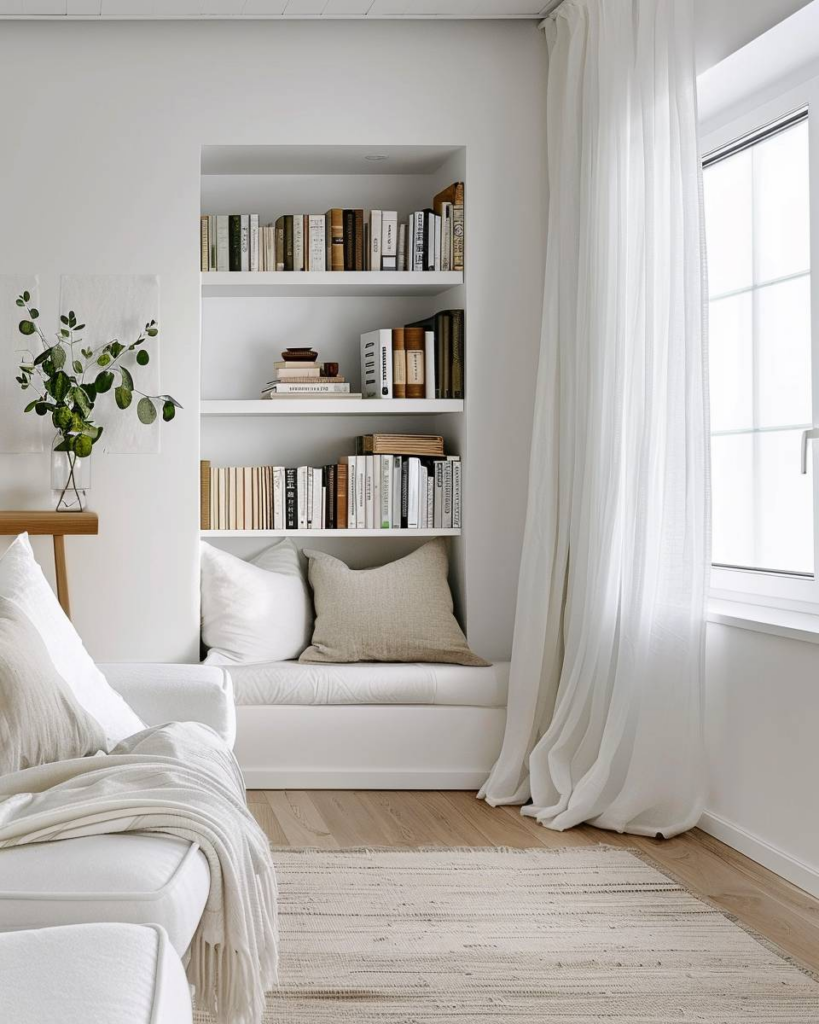 Schaffe eine gemütliche Leseecke am Fenster. Ein Sessel ist bequem. Ein kleines Regal hält Bücher griffbereit. Ein Kissen und eine Decke sorgen für Wärme. Wir setzen auf helle Textilien in Weiß für eine ruhige Atmosphäre.