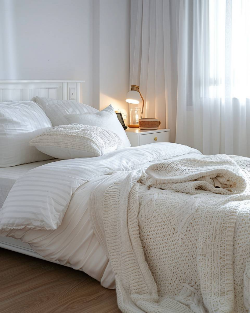 Lege eine Kuscheldecke ans Fußende des Bettes. In einem weißen Gästezimmer bringt sie Wärme und Gemütlichkeit. Wir wählen weiche Materialien, die zu Bettwäsche und Einrichtungsstil passen. So fühlt sich jeder Gast wohl, auch wenn es draußen kalt ist.