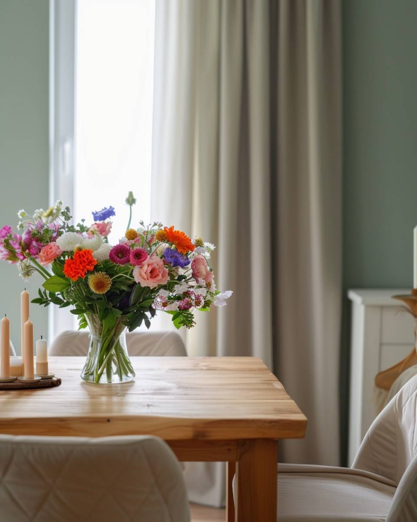 Stelle frische Blumensträuße in einer klaren Glasvase auf deinen Tisch. Wir wählen bunte Schnittblumen, die zur Saison passen. Frische Blumen bringen Farbe sowie Lebendigkeit ins Esszimmer und duften angenehm. Tausche das Wasser regelmäßig und halte die Sträuße kompakt, damit sie beim Essen nicht stören.
