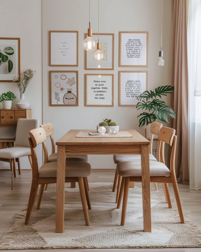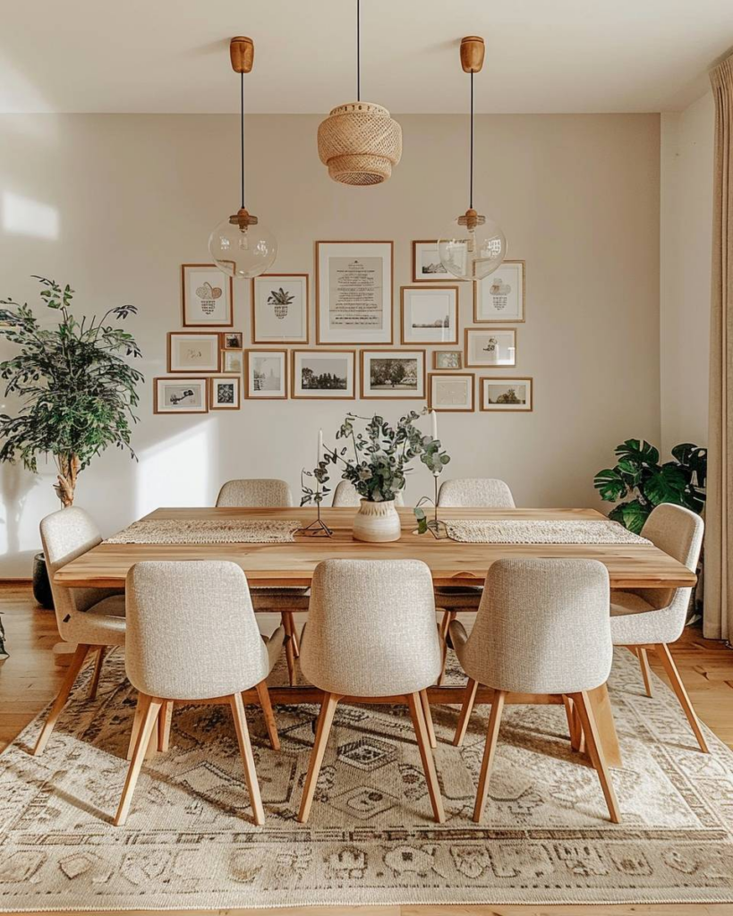 Hänge private Bilder als Wandgalerie auf. Wähle ruhige Farben für die Bilderrahmen. Platziere die Fotos in einer klaren Anordnung über dem Esstisch. Achte auf harmonische Abstände. So schaffst du schnell eine persönliche und entspannte Atmosphäre im Esszimmer.