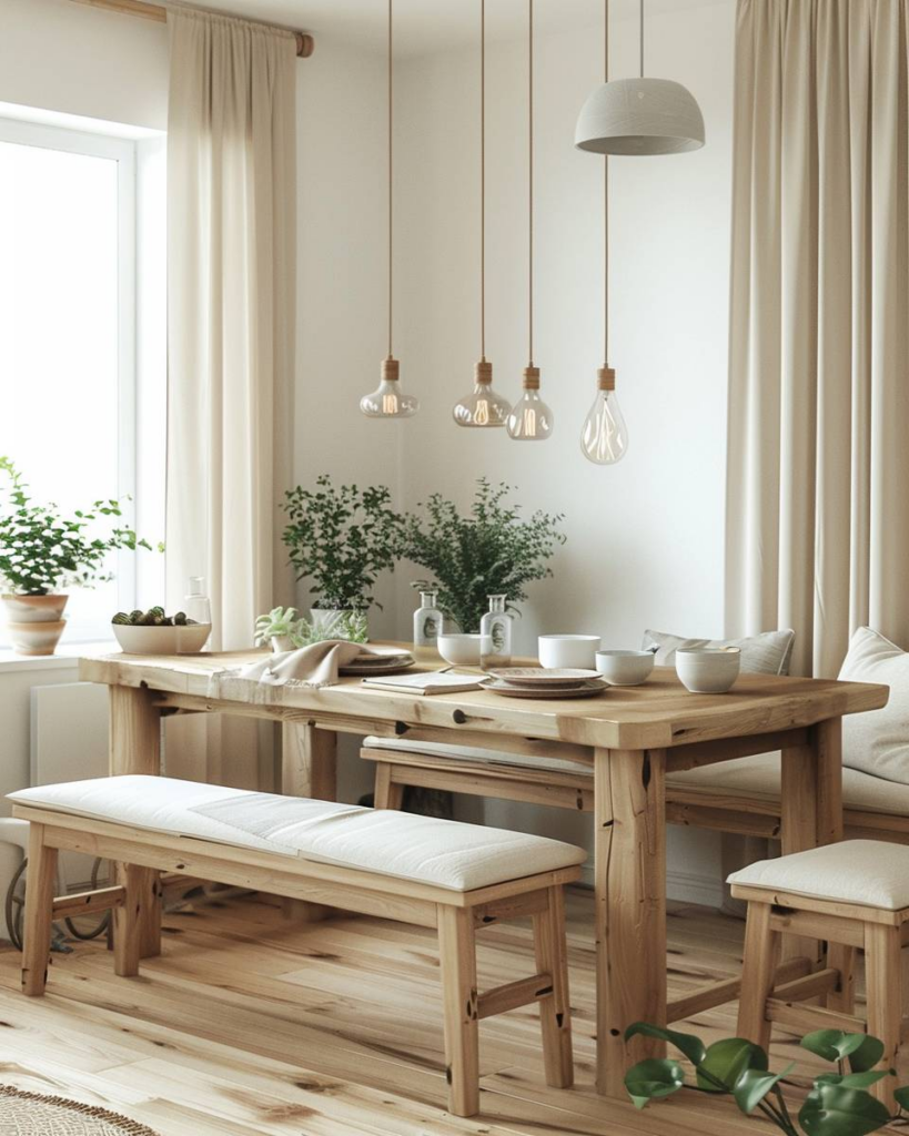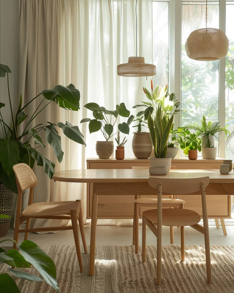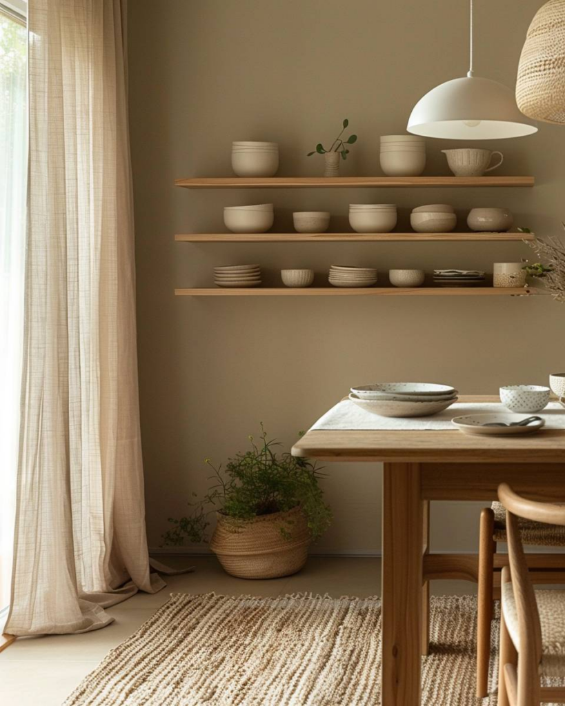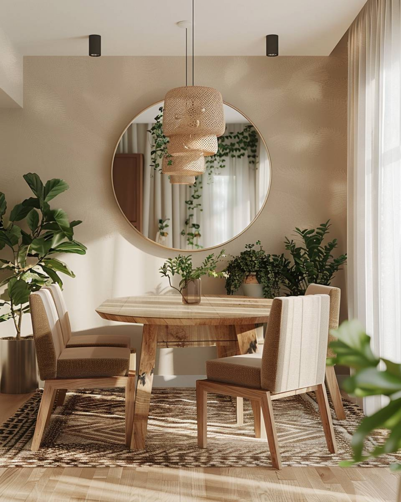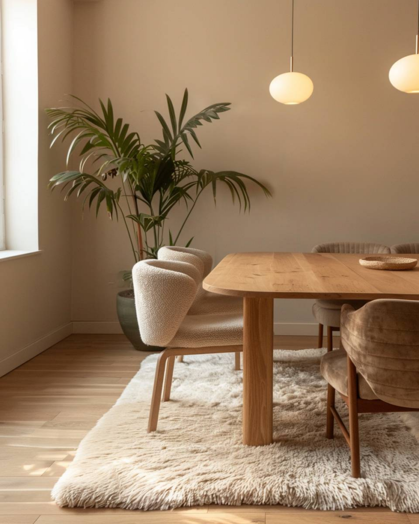 Nutze warme und natürliche Farben wie Ocker, Terrakotta, Beige und Holz für Wände, Möbel und Accessoires. Setze Akzente mit Kissen, Teppichen oder Vorhängen in diesen Tönen. Binde Pflanzen als grüne Ergänzung ein. Die Kombination sorgt für Gemütlichkeit und eine angenehme Atmosphäre beim Essen.