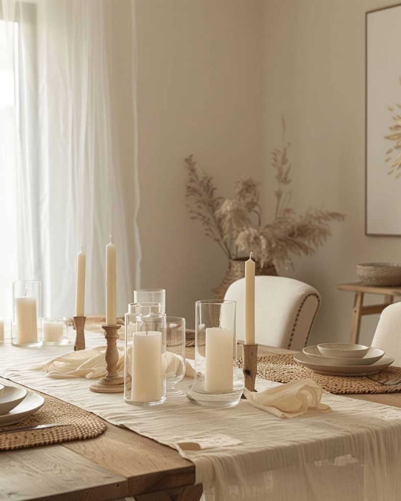 Wähle besondere Tischsets oder einen Tischläufer, um Farbe und Struktur auf deinen Tisch zu bringen. Muster, Materialien und Farben setzen Akzente und schützen deine Tischplatte. Natürliche Stoffe wie Leinen oder Baumwolle schaffen Gemütlichkeit und lassen das Esszimmer wohnlich wirken. Du kannst mit wechselnden Designs die Stimmung im Raum je nach Jahreszeit verändern.