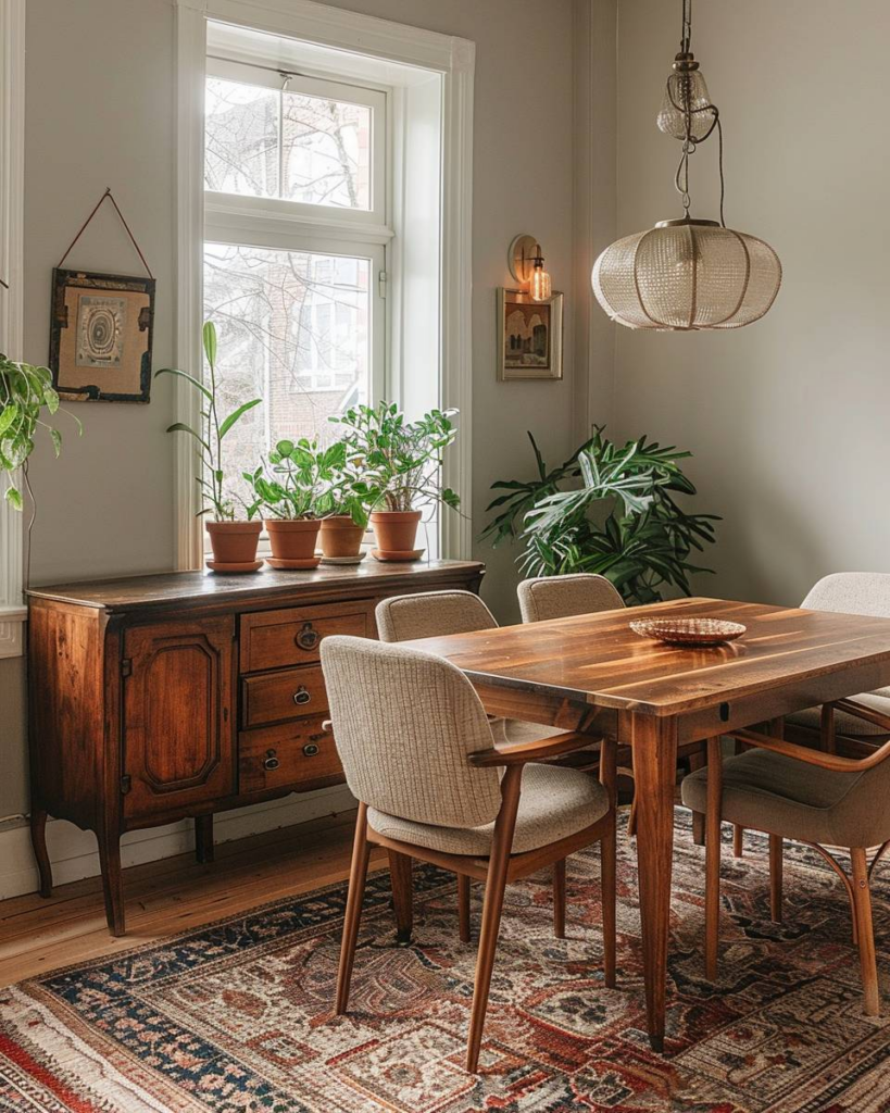 Wir mischen alte Möbel mit neuen Stücken. Ein rustikaler Holztisch ist der ideale Mittelpunkt. Moderne Stühle setzen spannende Akzente. Wir nutzen Vitrinen aus Oma’s Zeiten für Geschirr. Farben und Textilien verbinden alles zu deinem gemütlichen Esszimmer.