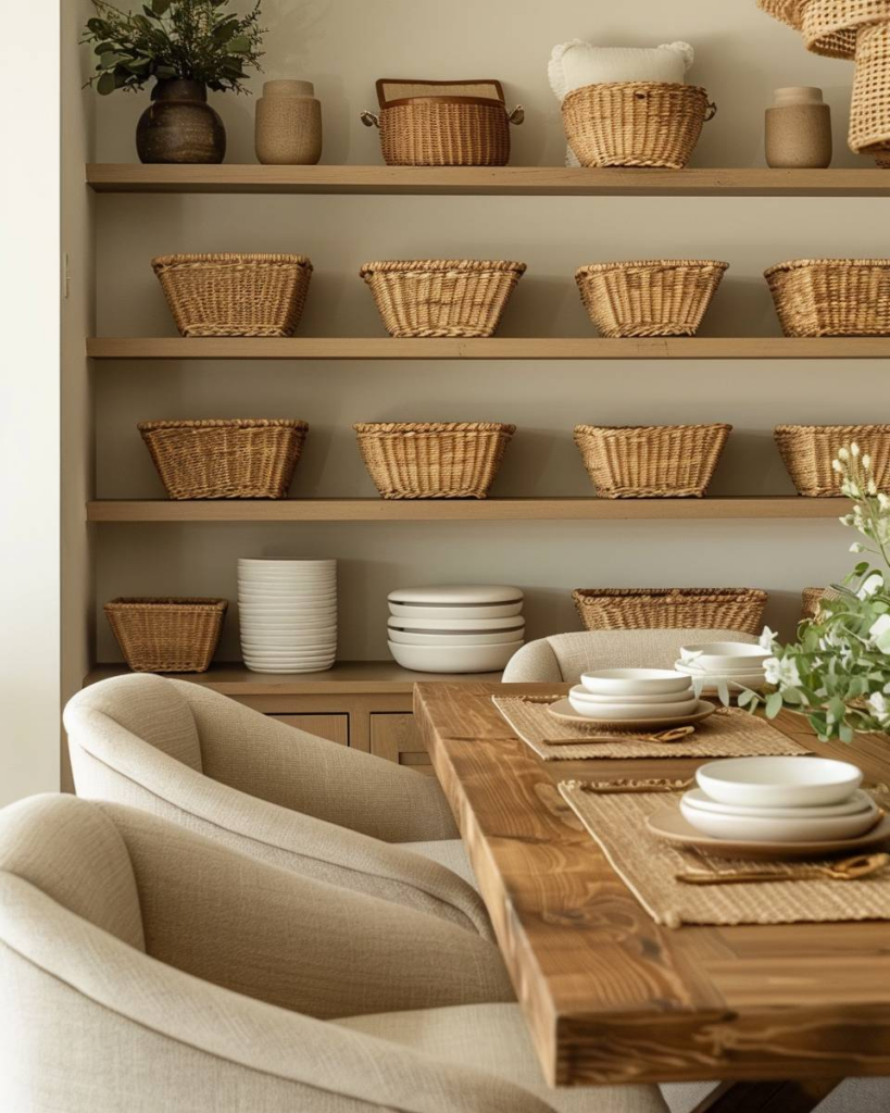 Stelle Körbe aus Naturmaterialien auf ein offenes Regal oder unter eine Bank. Wir wählen verschiedene Größen und Flechtarten, damit das Esszimmer ruhig und warm wirkt. Mit geschlossenen Körben bewahren wir Besteck, Servietten oder Tischsets ordentlich auf. Wir achten darauf, dass alle Körbe farblich zum Rest der Einrichtung passen.