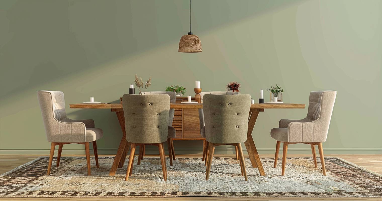 Lege einen Teppich unter deinen Esstisch. So wirkt das Esszimmer wärmer und einladender. Achte darauf, dass der Teppich groß genug für Tisch und Stühle ist. Wähle ein Material, das sich leicht reinigen lässt. Ein passendes Muster bringt Ruhe und Gliederung in den Raum.