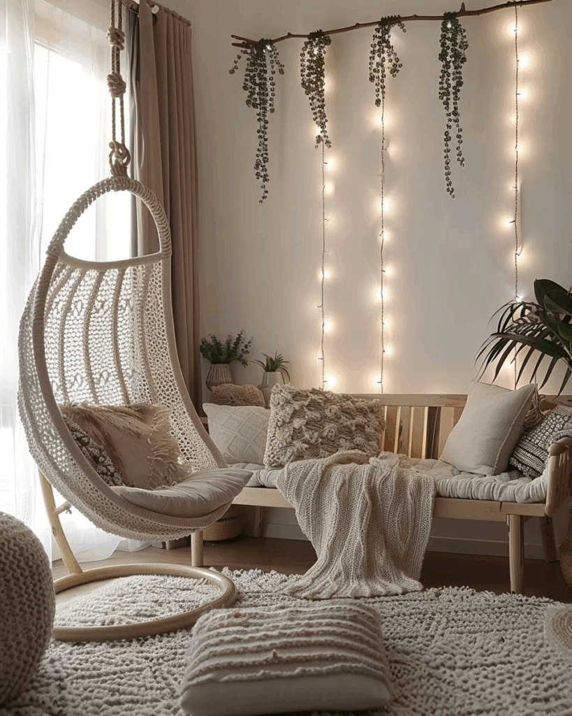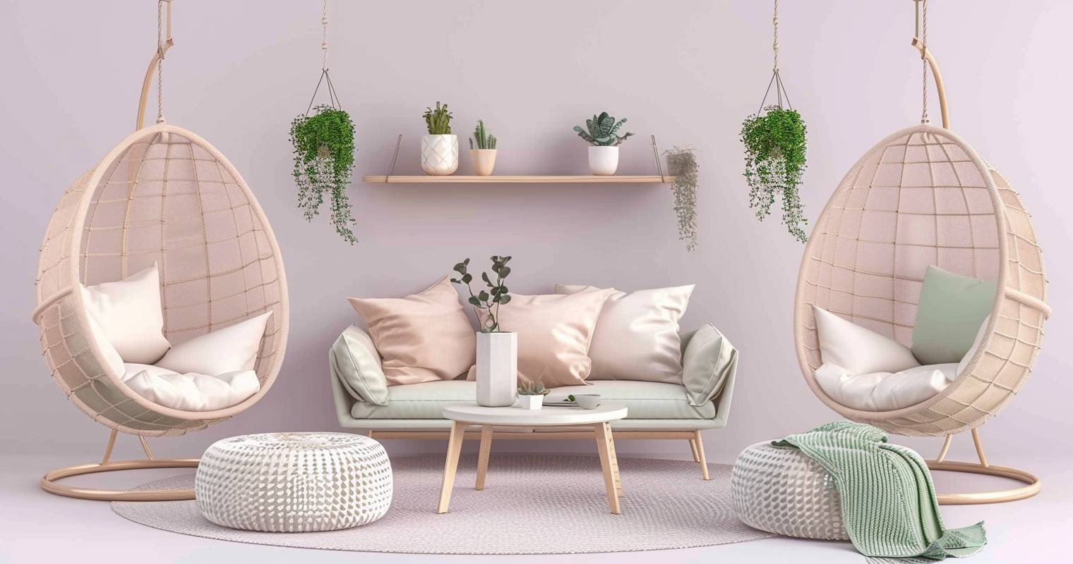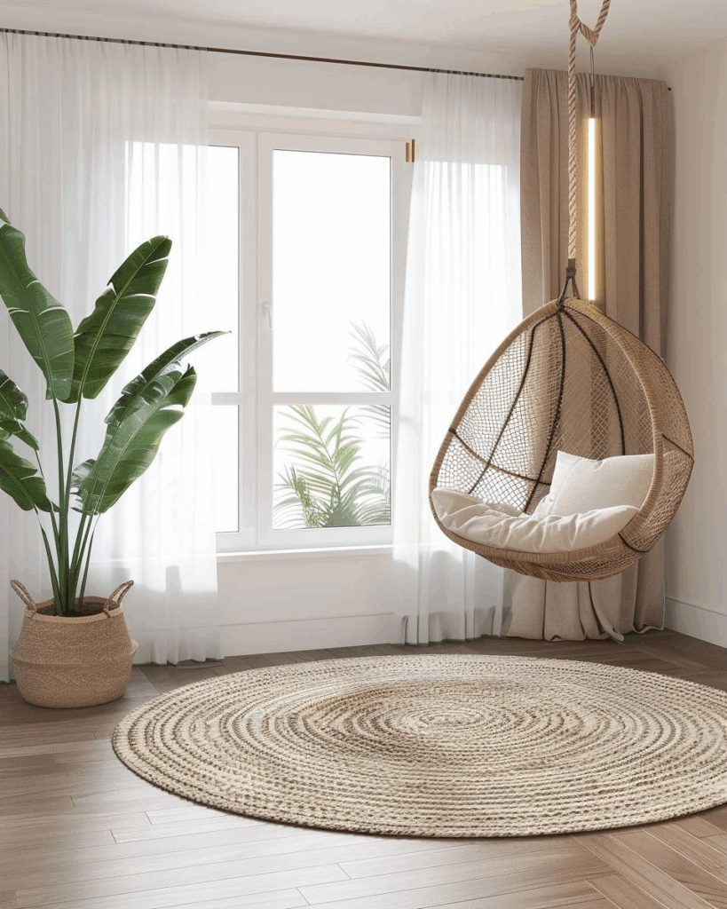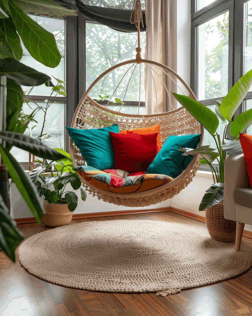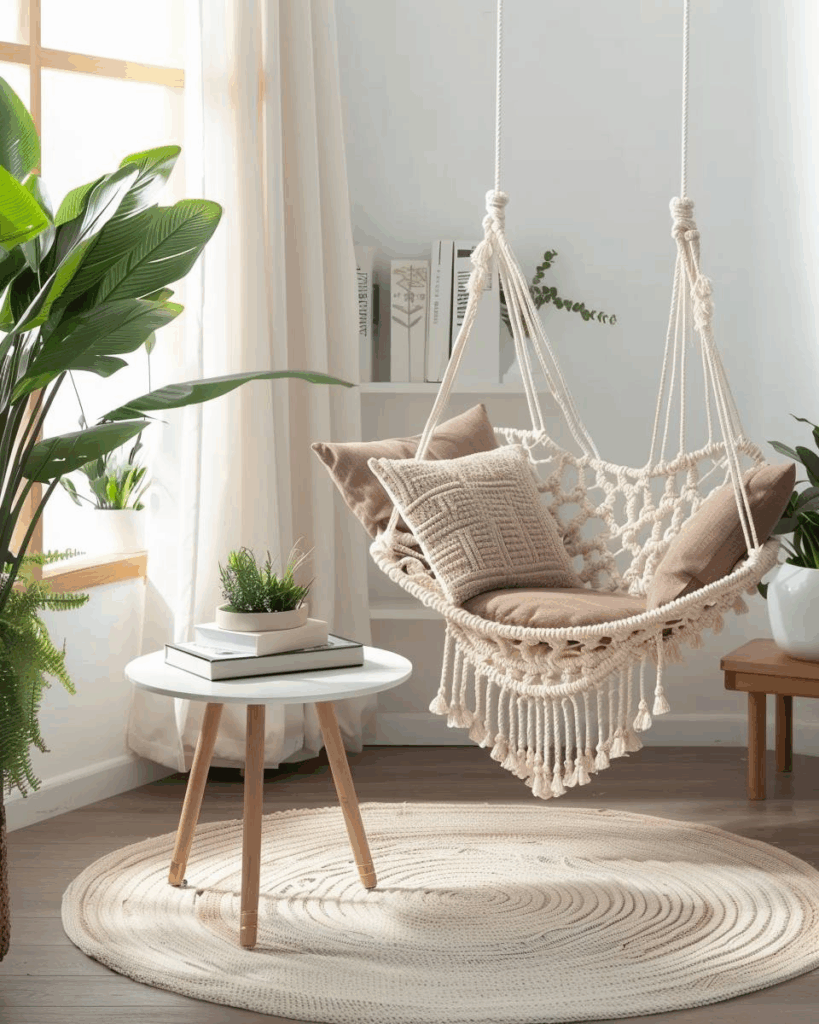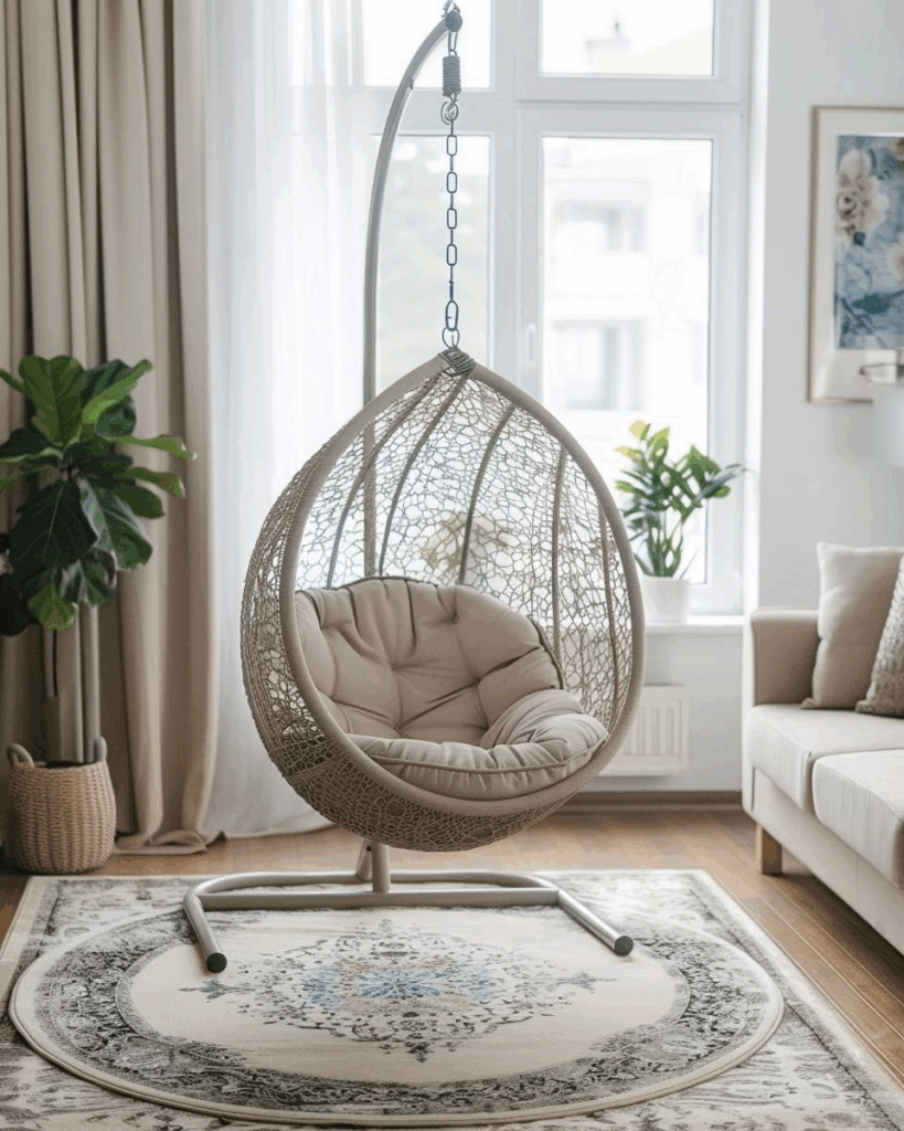 Ein Hängesessel ist ein echter Hingucker und bringt frische Ideen ins Wohnzimmer, um deine Wohlfühloase stilvoll zu gestalten und gemütlich einzurichten.