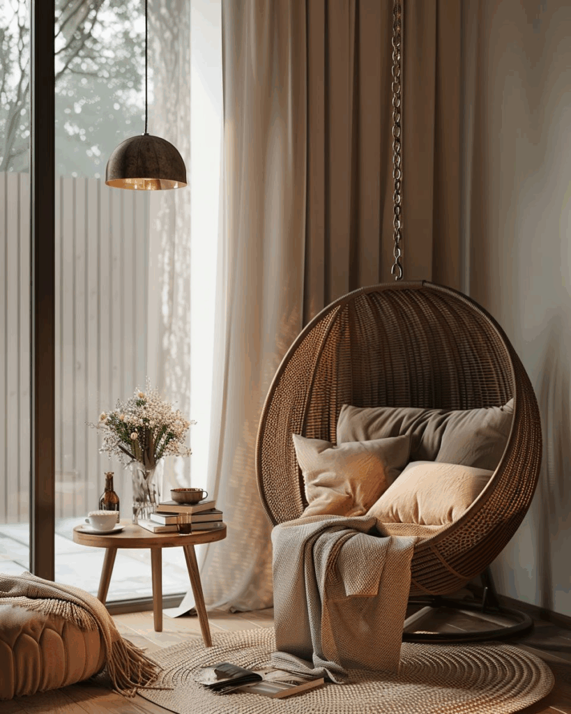 Dunkle Wohnzimmer-Ecken wirken mit einem Hängesessel einladender. Wir hängen ihn nah bei einer Lichtquelle auf. Ein Beistelltisch neben dem Sessel bietet Platz für Getränke oder Bücher. So schaffen wir eine gemütliche Leseecke, die du täglich nutzt.