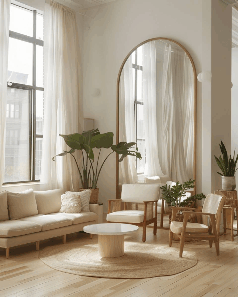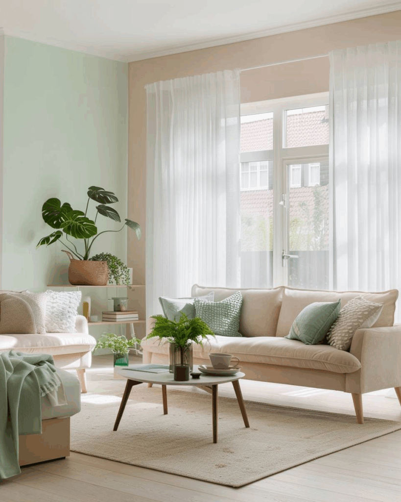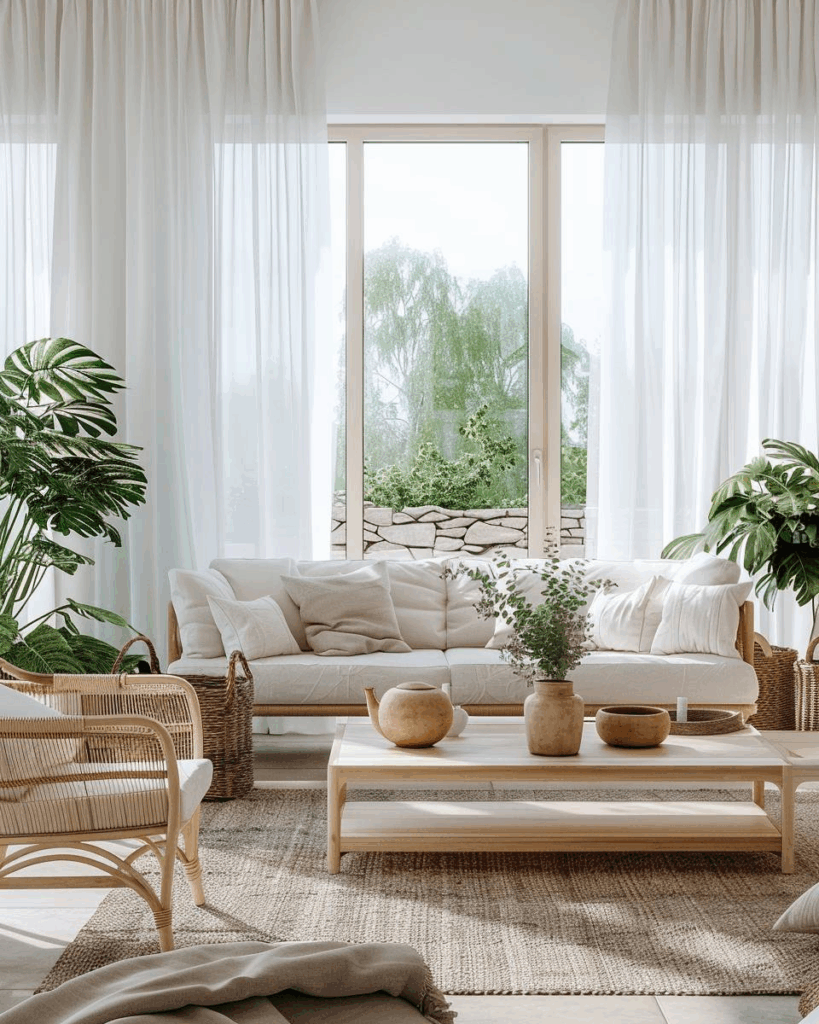 Verwende helle, dünne Vorhänge, damit das Tageslicht deinen Raum flutet. Transparente Stoffe wie Baumwolle oder Leinen lassen Licht hinein und schützen vor neugierigen Blicken. So wirkt dein Wohnzimmer gleich viel offener und freundlicher. Wähle Vorhänge in neutralen Farben, damit das Licht klar bleibt.
