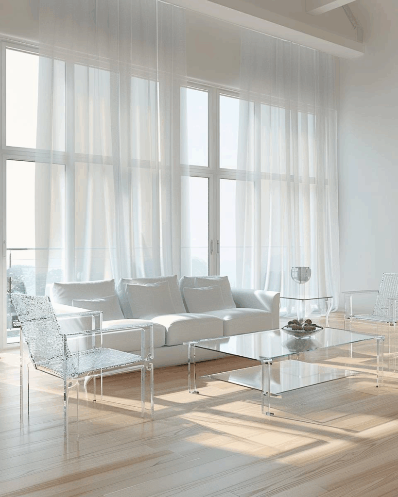 Wähle durchsichtige Möbel wie Glas-Couchtische oder Acryl-Regale, um dein Wohnzimmer offen zu gestalten. Klare Oberflächen reflektieren Licht und schenken mehr Helligkeit. Schmale Beistelltische sind dezent und lassen mehr Platz. So schaffen wir wirkliche Weite im Raum.
