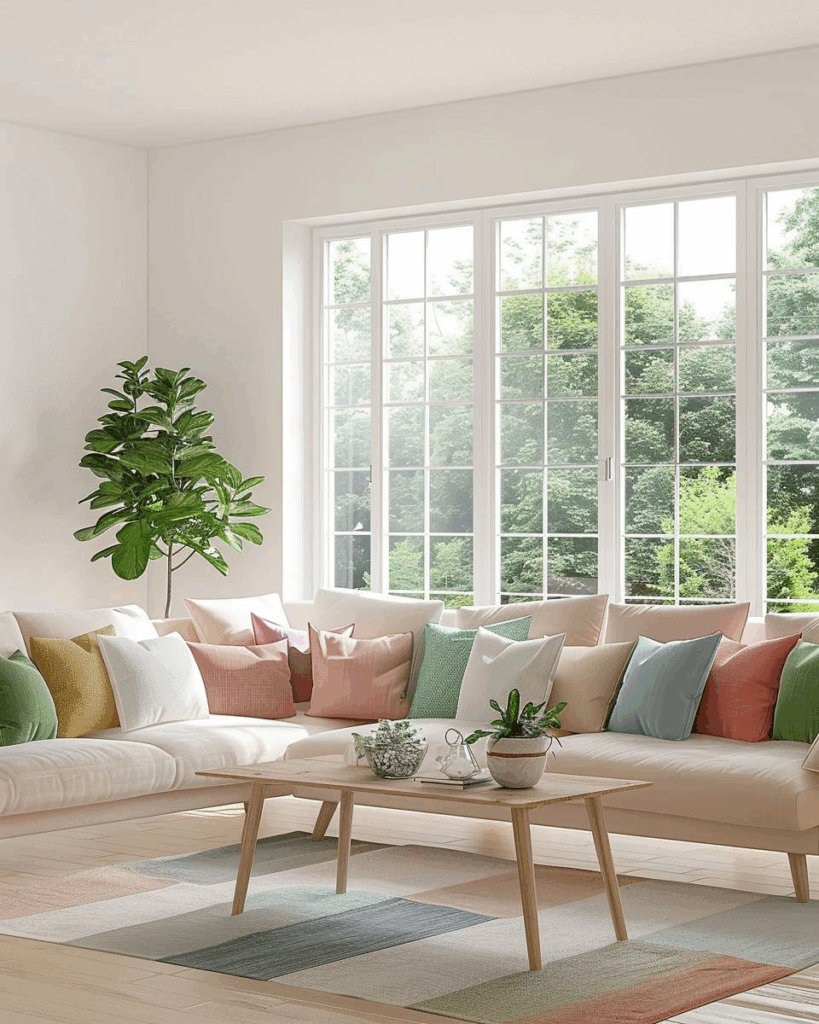 Setze auf sanfte Farbtöne wie Hellblau, Rosé oder Mint. Pastellfarben lassen das Wohnzimmer offen und freundlich wirken. Wir bringen mit hellen Farben mehr Licht ins Zimmer. Beige oder zartes Grau geben dir zusätzliche Ruhe.