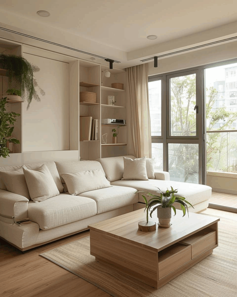 Setze auf multifunktionale Möbel, um dein Wohnzimmer offener zu gestalten. Ein Schlafsofa spart Platz und ist praktisch für Gäste. Ein Couchtisch mit Stauraum versteckt deine Sachen und hält die Fläche frei. Helle Materialien lassen Möbel leicht wirken.