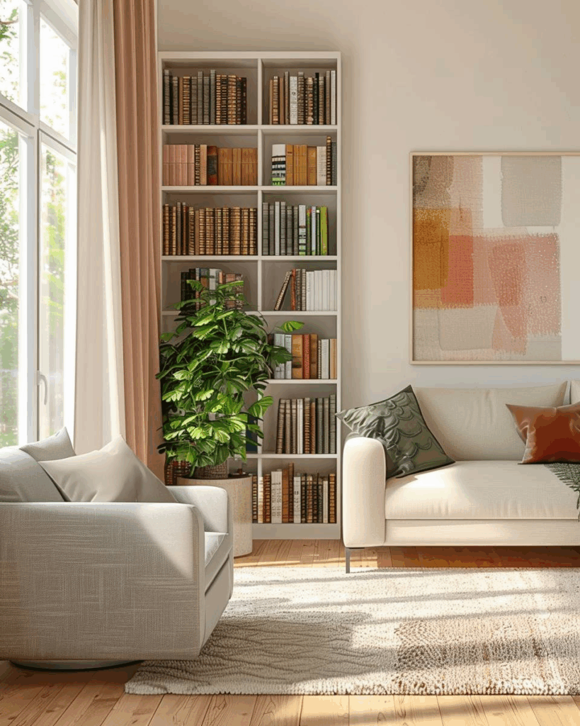 Setze offene Regale ein, damit dein Raum leicht und hell wirkt. Wir schaffen mehr Stauraum, ohne das Zimmer zu überladen. Mit Deko, Büchern und Pflanzen sorgst du für einen lockeren Look. Aufgeräumte Regale machen dein Wohnzimmer ordentlich.
