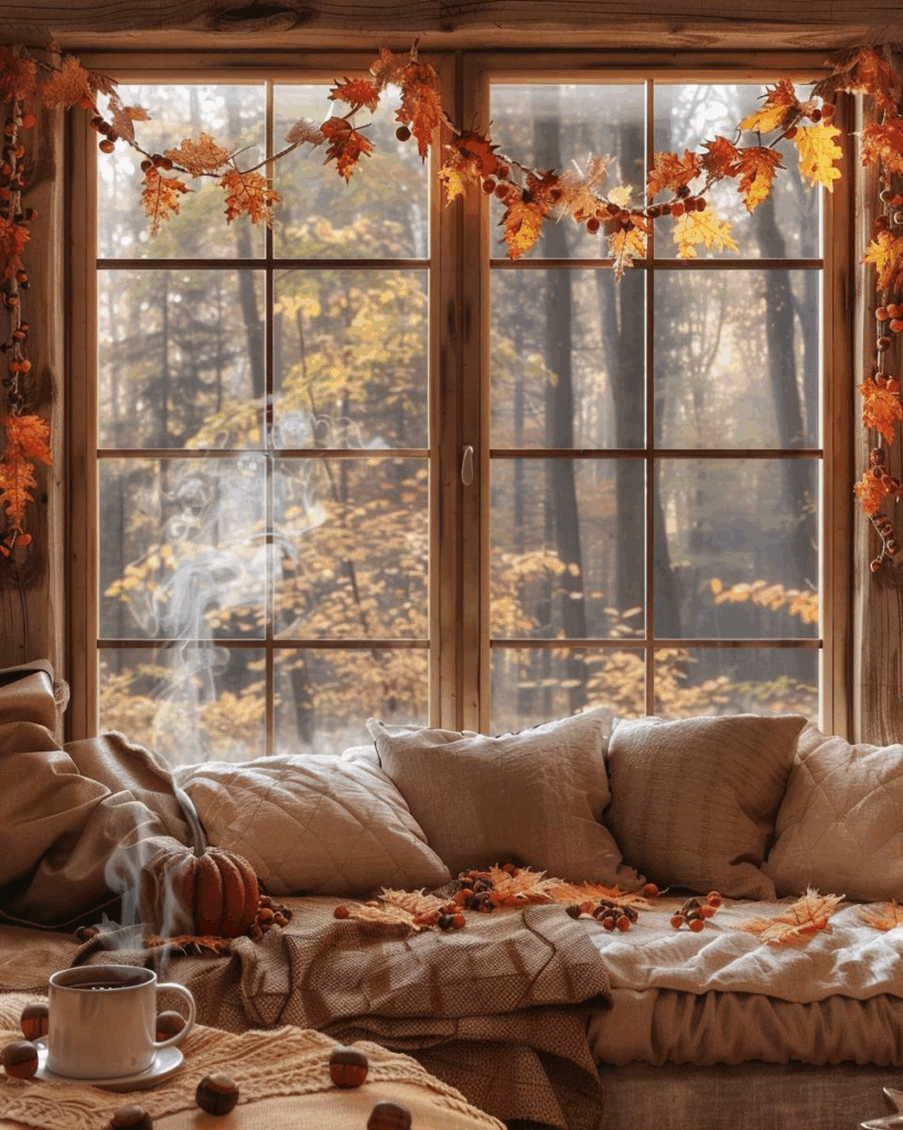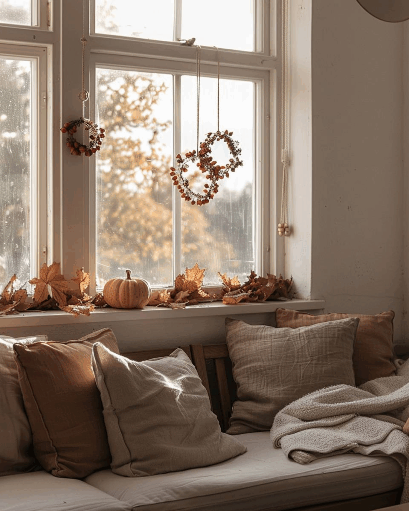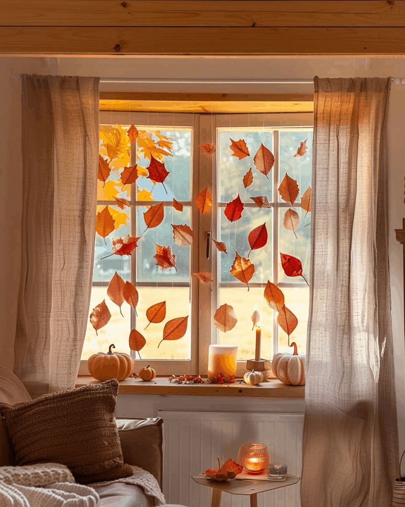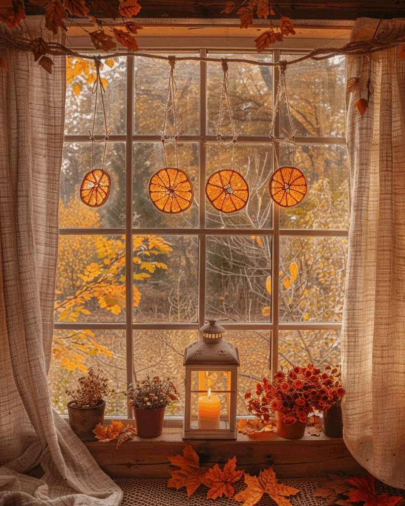 Wenn du dein Fenster herbstlich gestalten willst, helfen einfache Ideen wie bunte Blätter, kleine Kürbisse auf dem Fensterbrett und getrocknete Orangenscheiben im Licht.