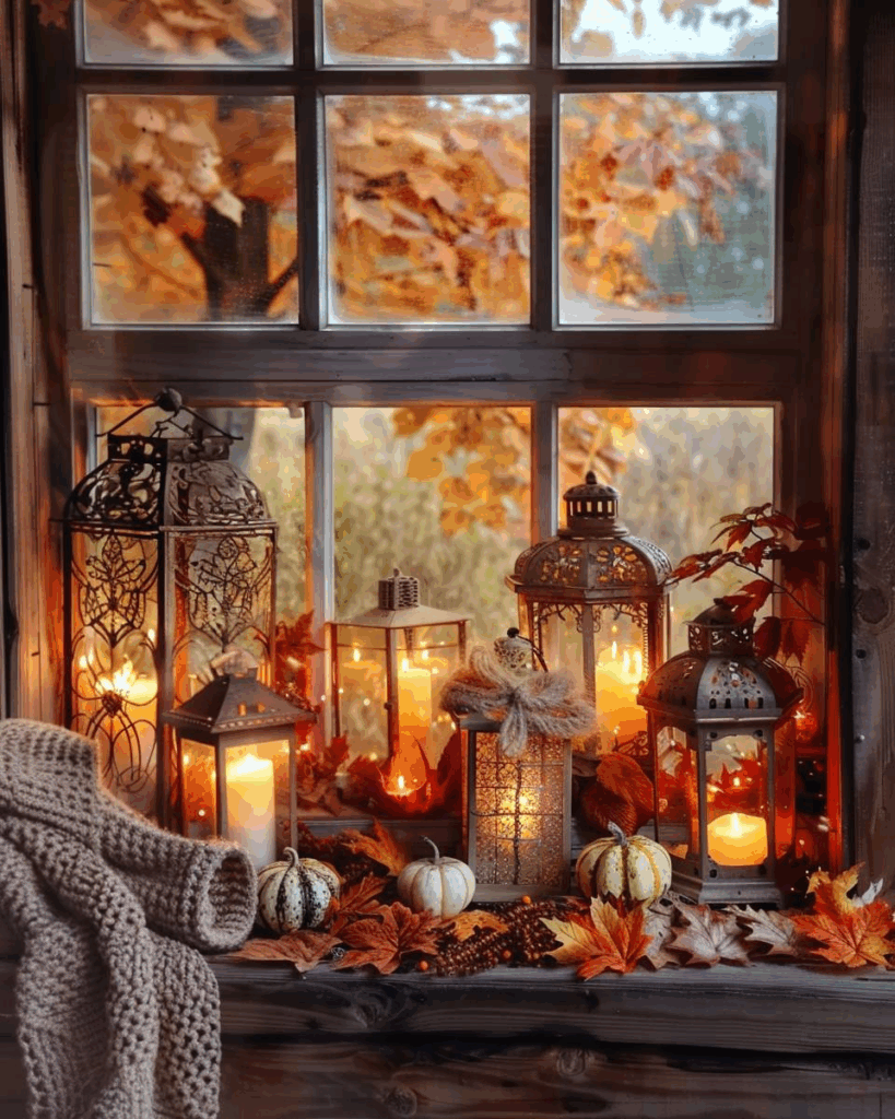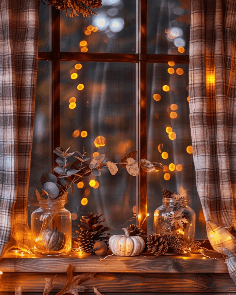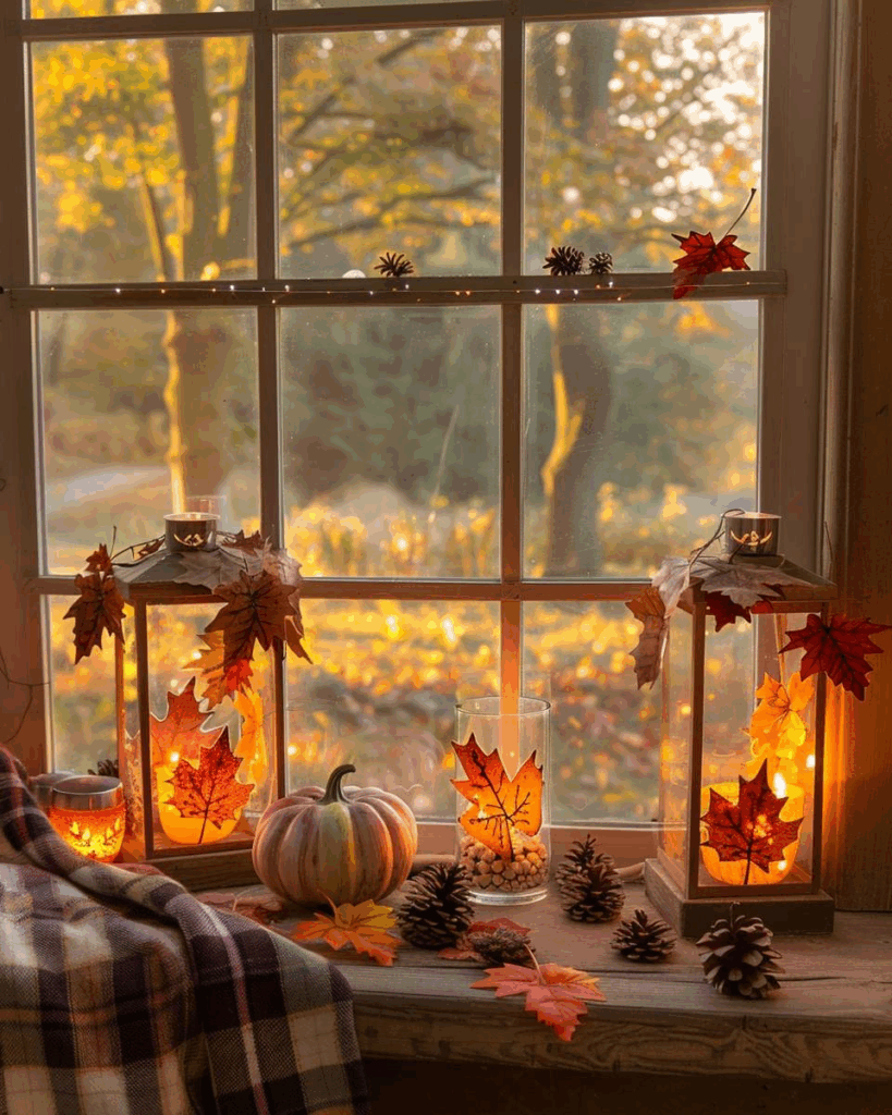 Setze Windlichter mit Laub- und Kürbismotiven auf die Fensterbank. Wähle Modelle aus Glas oder Metall, damit das Licht schön durchscheint. Nutze LED-Teelichter, damit nichts rußt. Platziere sie am besten neben kleinen Herbstzweigen oder Kastanien. So bekommt dein Fenster abends einen warmen, gemütlichen Look.