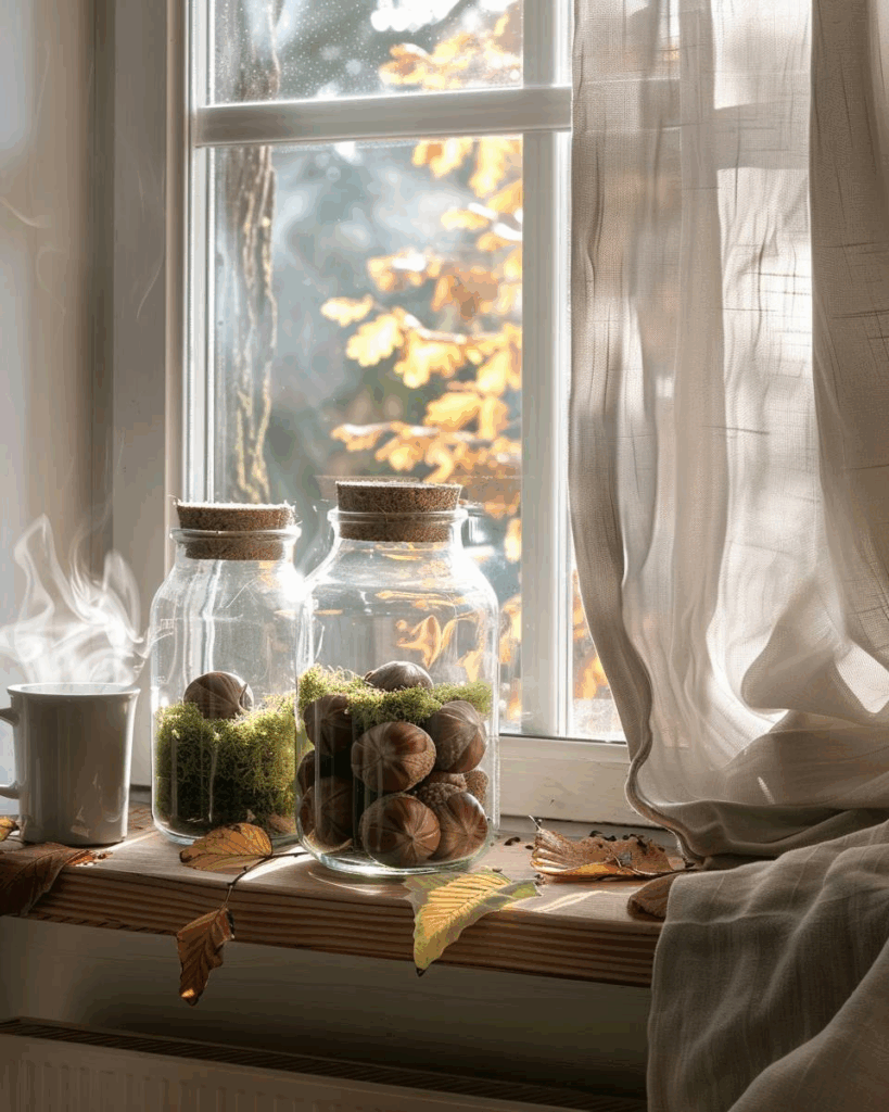 Greif zu Holz, Rinde oder Zweigen, um dein Fenster herbstlich zu dekorieren. Ein Ast im Glas oder eine kleine Holzschale mit Nüssen bringt sofort Wärme ins Spiel. Kombinier das mit getrockneten Blättern oder Moos für mehr Struktur. Naturmaterialien sehen nicht nur gut aus, sie halten auch lange und passen zu jeder Farbe. So wirkt dein Fenster ruhig, stimmig und echt.