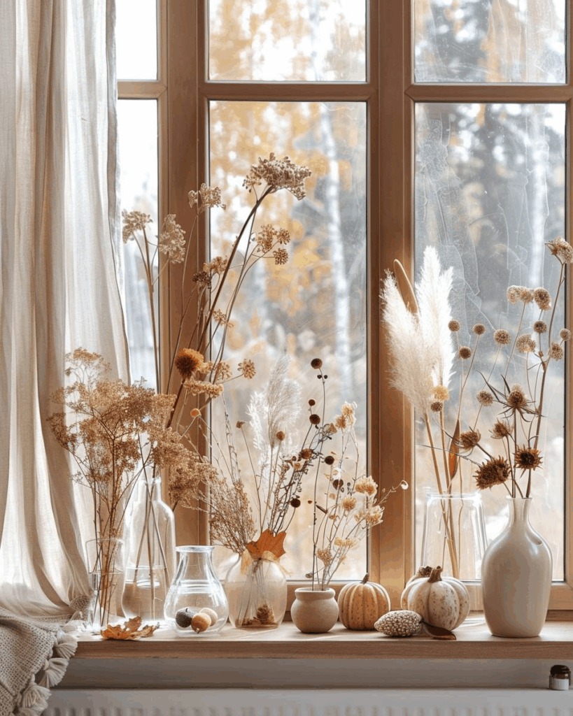 Setze auf Trockenblumen, um deinem Fenster im Herbst natürliche Farbtupfer zu geben. Kombiniere Gräser wie Pampasgras, Lagurus oder Disteln mit kleinen Vasen oder hänge sie mit Juteband ins Fenster. Trockene Hortensien oder Eukalyptus halten lange und verblassen nicht. Wichtig ist, dass du sie lichtgeschützt platzierst, sonst verlieren sie Farbe. So bringst du Struktur und Herbststimmung ins Fenster.