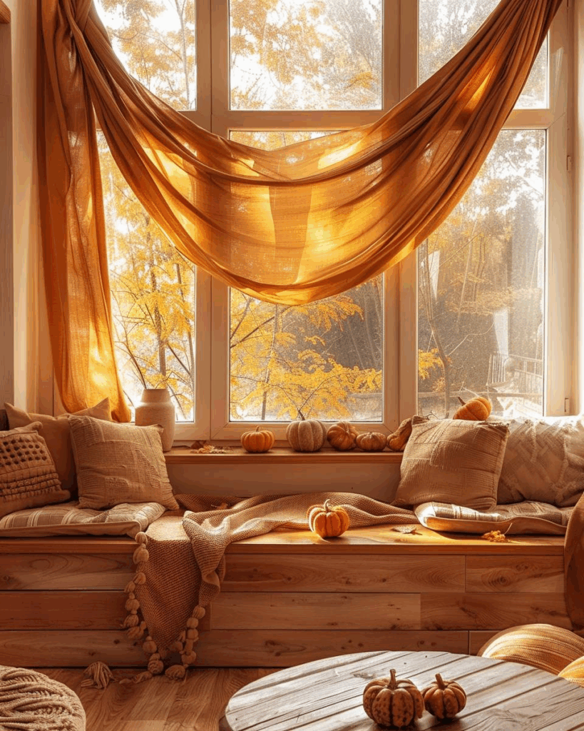 Lege einen herbstlichen Stoff locker über die Fensterbank, sodass er sanft fällt. Wähle dafür ein leichtes Leinen oder Baumwolle in warmen Farben wie Rost, Senf oder Dunkelgrün. Lass die Enden asymmetrisch hängen, das wirkt entspannter. Ergänze den Stoff mit kleinen Kürbissen oder getrockneten Blättern als Deko. So bringst du sofort Herbststimmung ans Fenster.