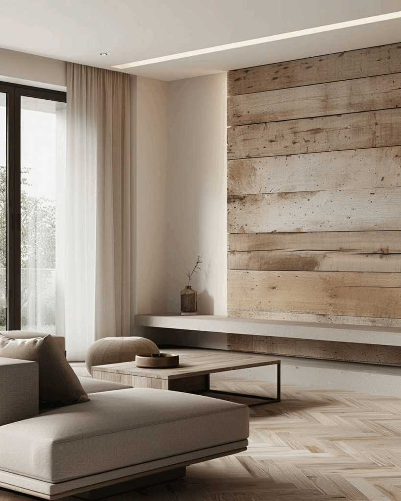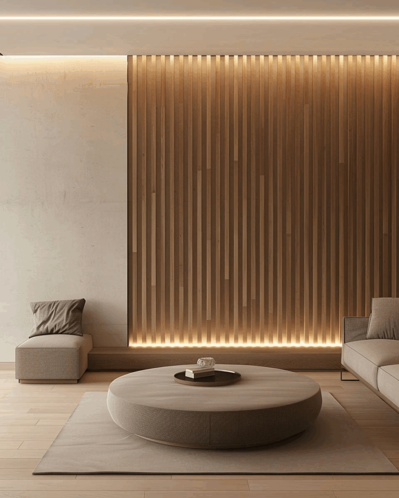 Setze auf vertikale Holzlatten, helle Steinriemchen und markante 3D-Paneele für Akzentwände; richte Räume ein.