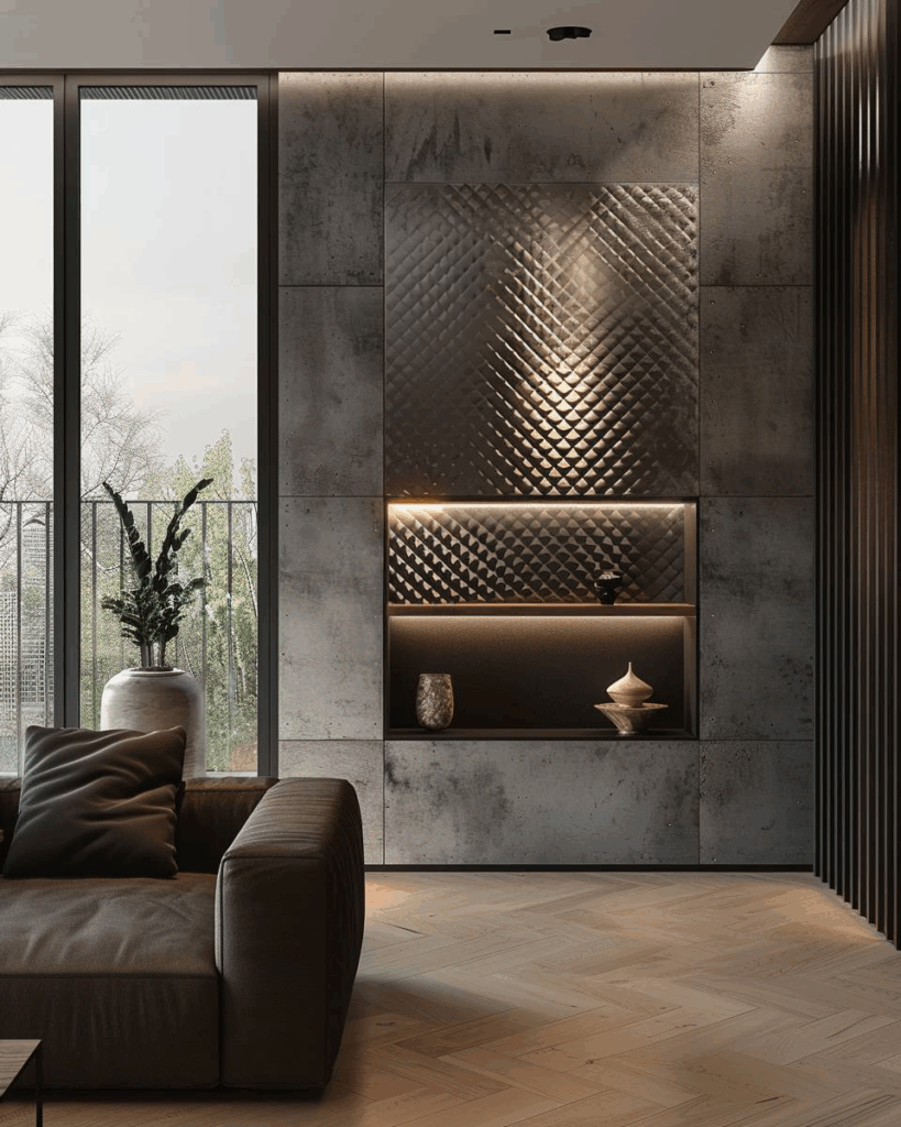 Verwende 3D-Paneele für lebendige Schatten. Wir wählen eine Relief-Tiefe von 10–20 mm für klare Kanten. Deine Lichtquelle ist ein warmweißer LED-Spot mit 2700–3000 K. Abstand zwischen Spot und Wand ist 30–60 cm. Ausrichtung zur Lichtquelle ist schräg; Wandfarbe ist matt für starken Kontrast.