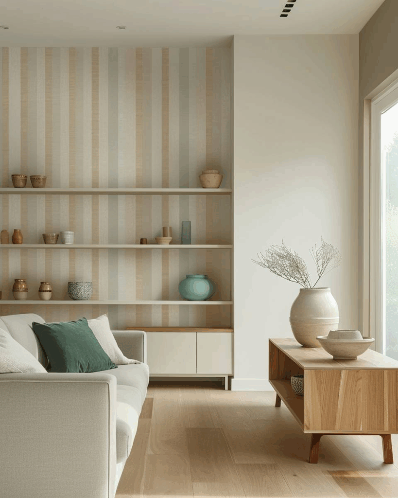 Wechsle Tapetenmuster von groß zu klein. Raumgröße ist dein Maßstab. Großes Muster ist stark auf der Akzentwand und teilt Flächen. Feines Muster ist ruhig an Nebenwänden und setzt Kontrast mit Farbe. Rapport und Streifenrichtung sind wichtig, wir richten sie an Kanten aus.
