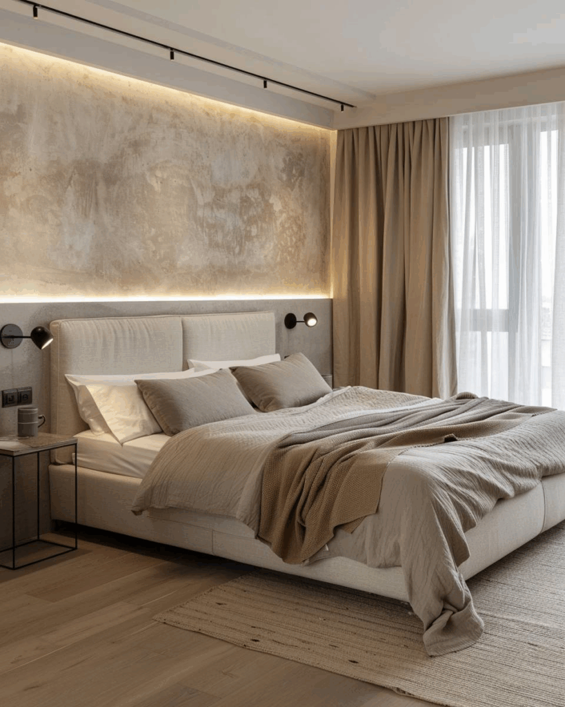Wir betonen die Bettwand mit Mikrozement. Mikrozement ist fugenlos, hart und abriebfest und schützt die Kopfteilzone. Bereite den Untergrund vor: schleife, entstaube, grundiere und zwei dünne Lagen spachteln. Die Versiegelung in matt oder seidenmatt schützt vor Flecken und Wasser. Du steuerst Farbton und Textur mit Pigment und Spachteltechnik.