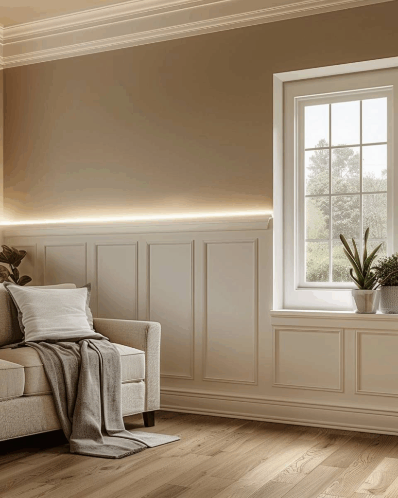 Du setzt Leisten als elegante Wandrahmen ein. Wähle MDF oder Holz mit passender Stärke. Plane ein Raster und lasse 8–12 cm Abstand zum Rand. Säge 45° Gehrungen, klebe mit Montagekleber und richte mit Wasserwaage aus. Du verfugst mit Acryl und streichst im Wandton für ein ruhiges Bild.
