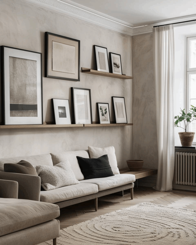 Setze Bildleisten als flexible Wandgalerie ein. Deine Wand ist sicher mit passenden Dübeln und Schrauben. Traglast pro Leiste ist begrenzt; prüfe Herstellerangaben und verteile Gewichte. Eine Wasserwaage ist Pflicht; richte Leisten auf Augenhöhe und im Raster aus. Abstand zwischen Rahmen ist 5–7 cm; tausche Motive schnell aus.