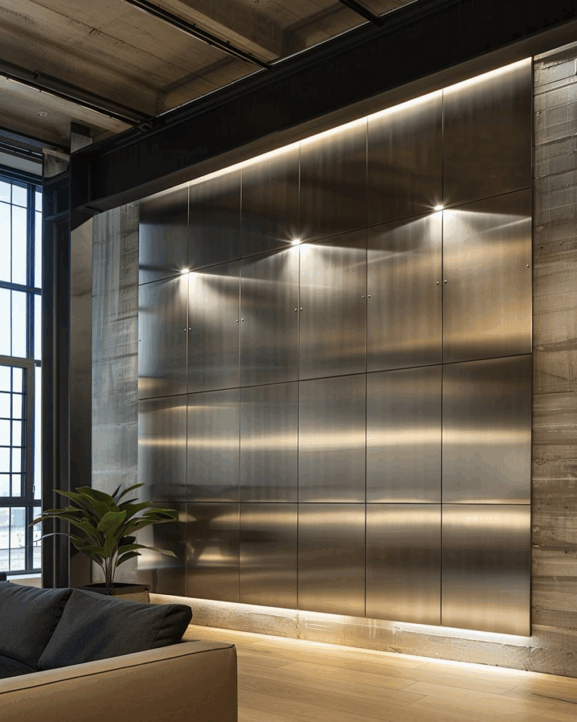 Bringe Metallpaneele für den Industrie-Look an, aus Aluminium, Stahl oder Cortenstahl. Du prüfst den Untergrund: er ist tragfähig, eben und trocken. Richte die Tragprofile lotrecht aus und verankere sie sicher. Wir nutzen Dübel, Edelstahlschrauben und Wasserwaage; Fugen sind 3–5 mm. Oberfläche ist Rostschutz oder Klarlack; Akustik ist Dämmmatte hinter den Paneelen.