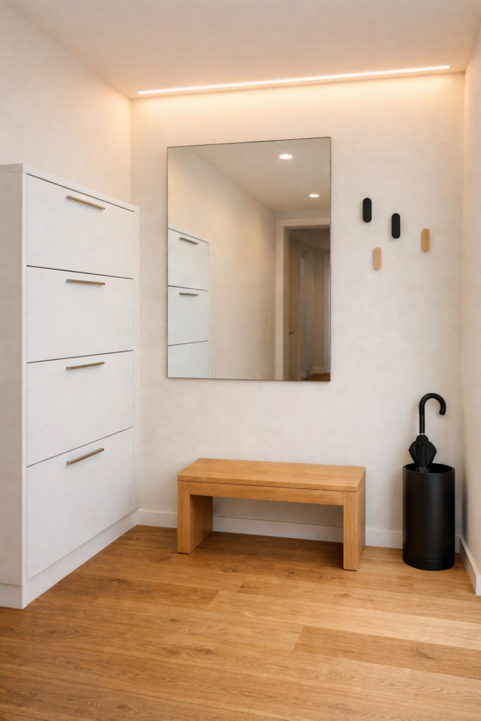 Halte den Fußboden immer leer und sauber. Stauraum wie Sitzbank mit Fach, Schuhschrank oder Wandhaken sorgt für Ordnung. Wir entfernen regelmäßig Schuhe und Dreck. So bleibt der Flur offen und wirkt größer.