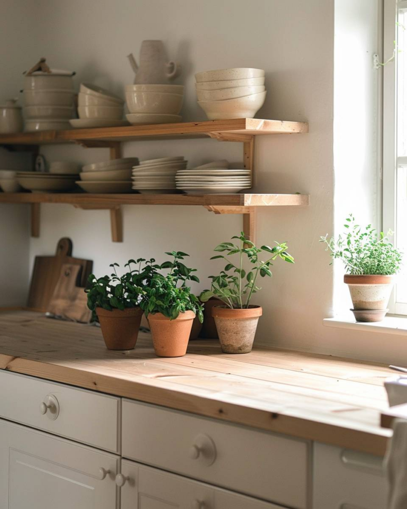 Stelle frische Kräuter wie Basilikum und Schnittlauch in schlichte Tontöpfe auf das Fensterbrett. Die natürliche Optik der Tontöpfe passt perfekt zum Hygge-Stil. Wir haben so immer griffbereit frische Kräuter zum Kochen. Die Pflanzen sorgen für Duft, Farbe und ein warmes Wohngefühl in der Küche.