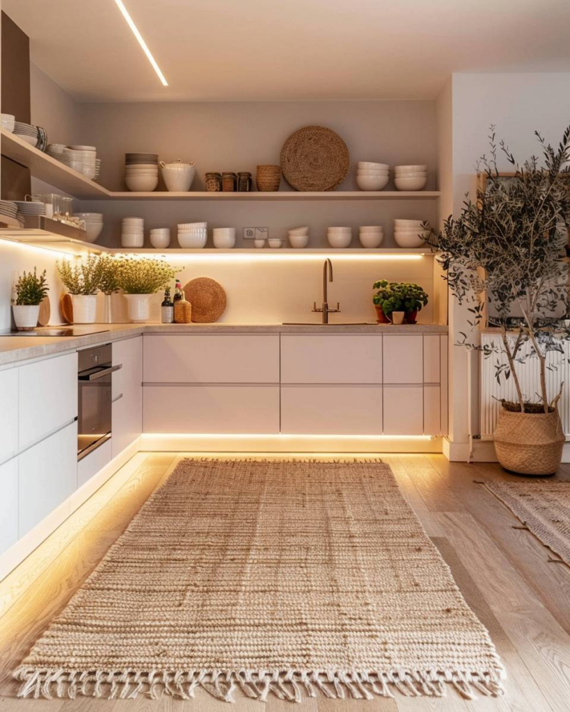 Betone Wohlfühlen mit weichen Teppichen. Teppiche dämpfen Geräusche, halten deine Füße warm und bringen sofort Wohnlichkeit in die Küche. Wähle rutschfeste Modelle, damit sie sicher liegen. Farben wie Beige oder Grau schaffen eine ruhige Atmosphäre.