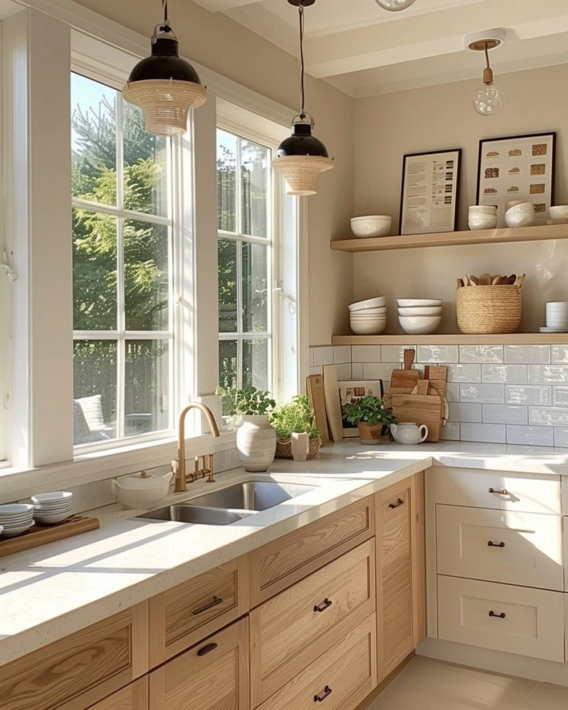 Setze auf warmen Sand, sanftes Beige und helles Taupe. Diese Farben strahlen Ruhe aus und machen deine Küche gemütlich. Kombiniere sie mit Holzmöbeln und natürlichen Stoffen. So entsteht ein ruhiges und harmonisches Raumgefühl.