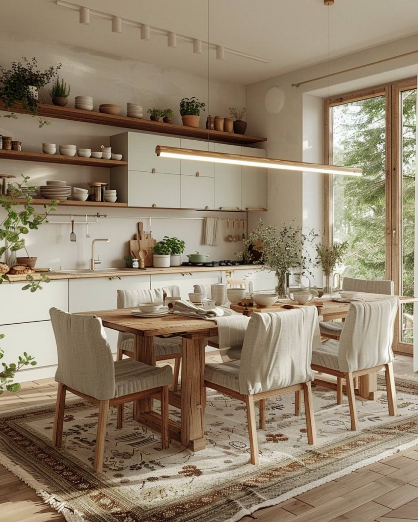 Wähle weiche Übergänge. Farben wie Beige, Grau und Off-White passen besser als Schwarz-Weiß-Kombis. Helle Holztöne schaffen Wärme. Textilien wie Leinen oder Baumwolle geben dem Raum Ruhe. So ist die Atmosphäre in deiner Küche entspannter.