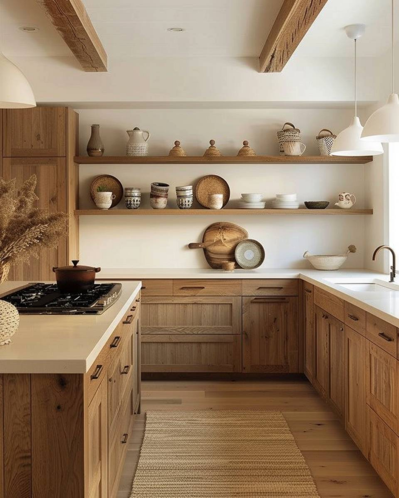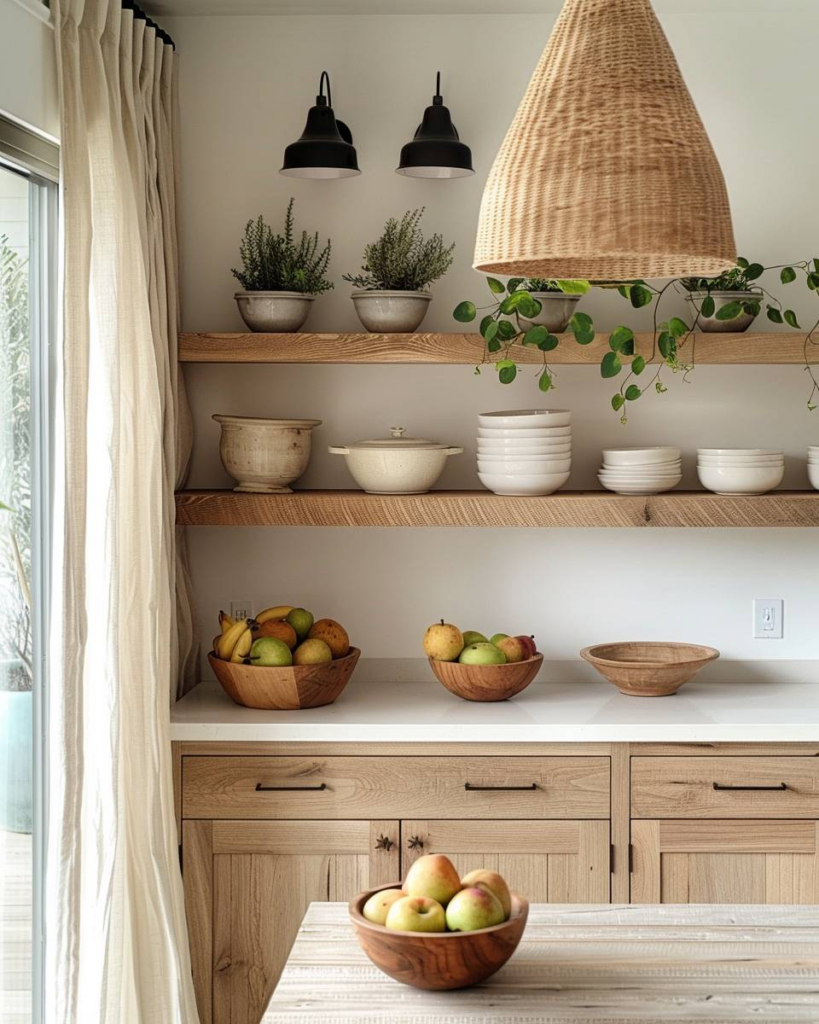 Setze natürliche Holzelemente ein, gestalte die Wände in sanften, erdigen Farbtönen und dekoriere mit handgemachter Keramik.