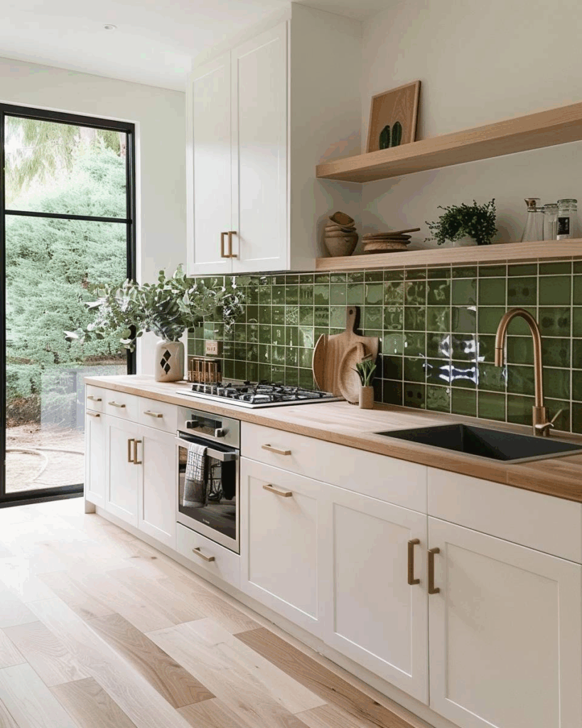 Setze Akzente im Fliesenspiegel, wähle offene Regale in Olivtönen und streiche eine Wand in olivgrüner Farbe – so richtest du deine Küche stilvoll und individuell ein.