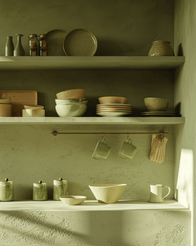 Arrangiere Geschirr in Olive-Shades auf Sicht